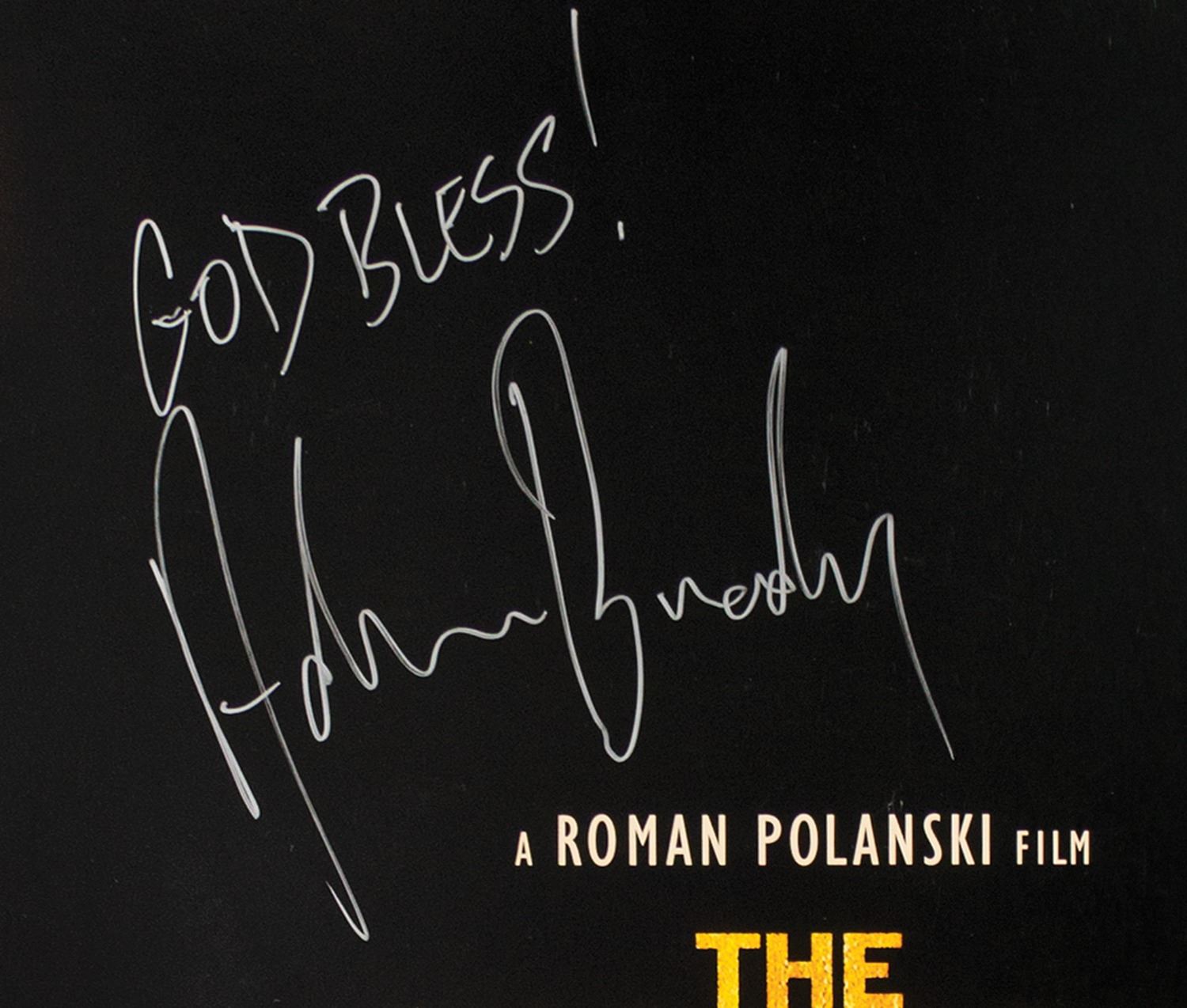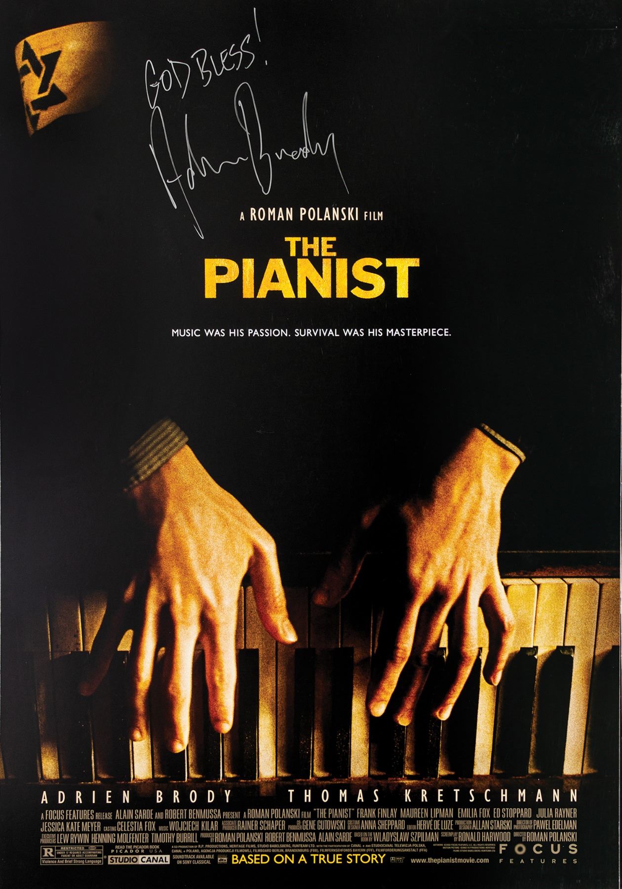 (Focus Features, 2002) A one sheet poster for The Pianist, signed by actor Adrien Brody. The poster was used and signed at a Broadcast Film Critics Association event, and measures 39.75"x26.75". The poster is backed with foamcore and is in good condition with some creasing and wear around the edges.