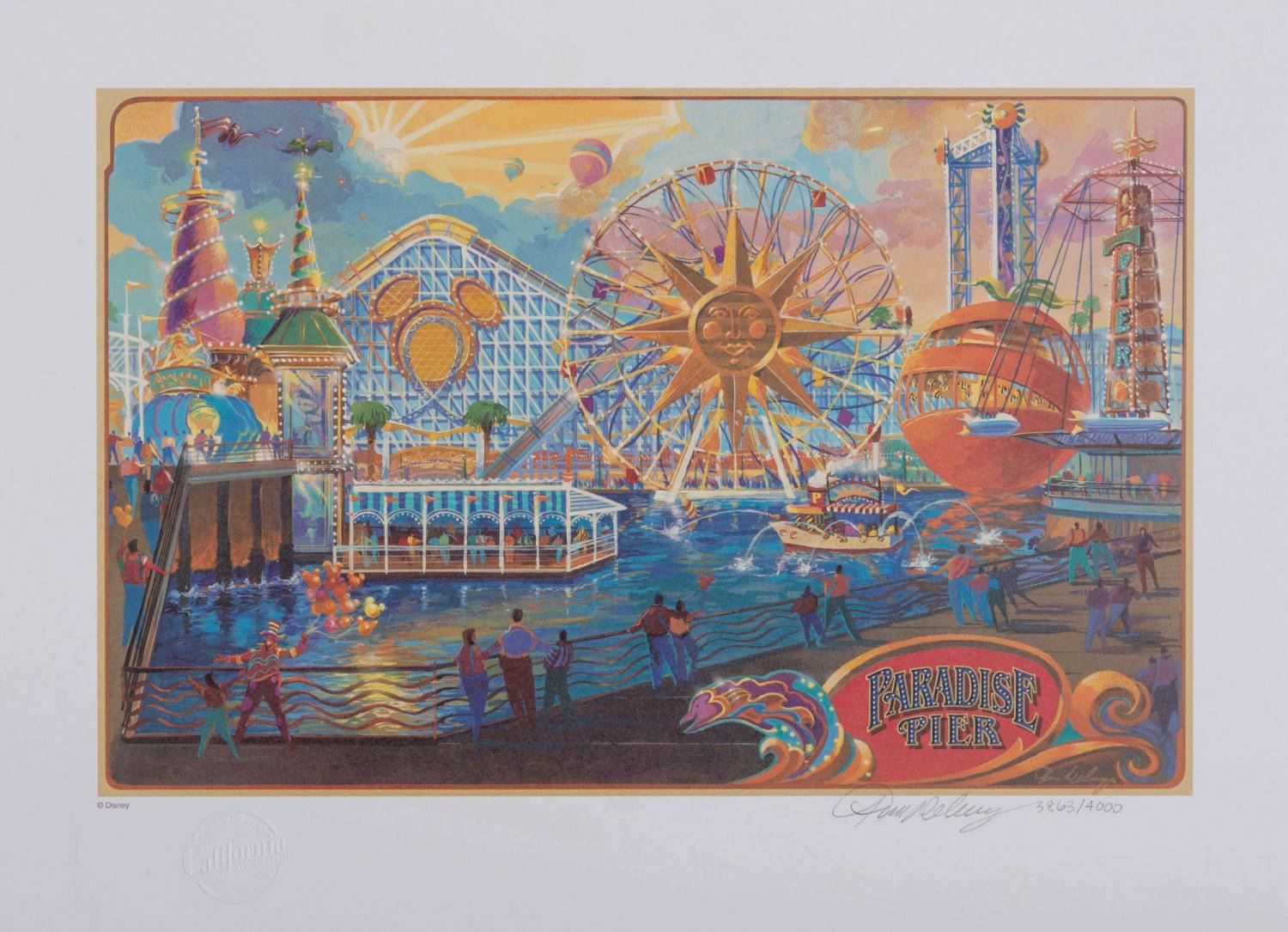 (California Adventure, c.1999) A signed Cast Member lithograph of Paradise Pier at Disney California Adventure by Imagineer Tim Delaney. Delaney was one of the first Imagineers to join the DCA project in 1995, serving as a designer for multiple areas. The piece offers a vibrant concept rendering for Paradise Pier by Delaney and is hand-numbered 3863/4000. There is an embossed seal on the bottom left of the print denoting it as part of the California Adventure Cast Member Commemorative Series. Measuring 14.5"x20" overall with an image area of 11"x17", the print is in fine condition with a minor scuff in the bottom left corner and small spot stain in the bottom right corner.