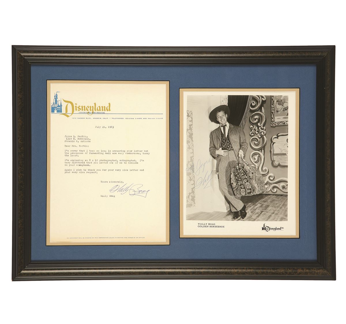 (Disneyland, 1963) Wally Boag Signed letter on Disneyland Stationary and Signed 8"x10" photo. Wally Boag was the headliner at The Golden Horseshoe from 1955 until 1982, an amazing career by one of the most beloved and legendary performers at the park. The letter, dated 1963 is in answer to a request for the autographed photo. Both have been beautifully framed for presentation. Letter: 8.5" x 11" Photograph: 10" x 8" Frame: 17" x 22.5"