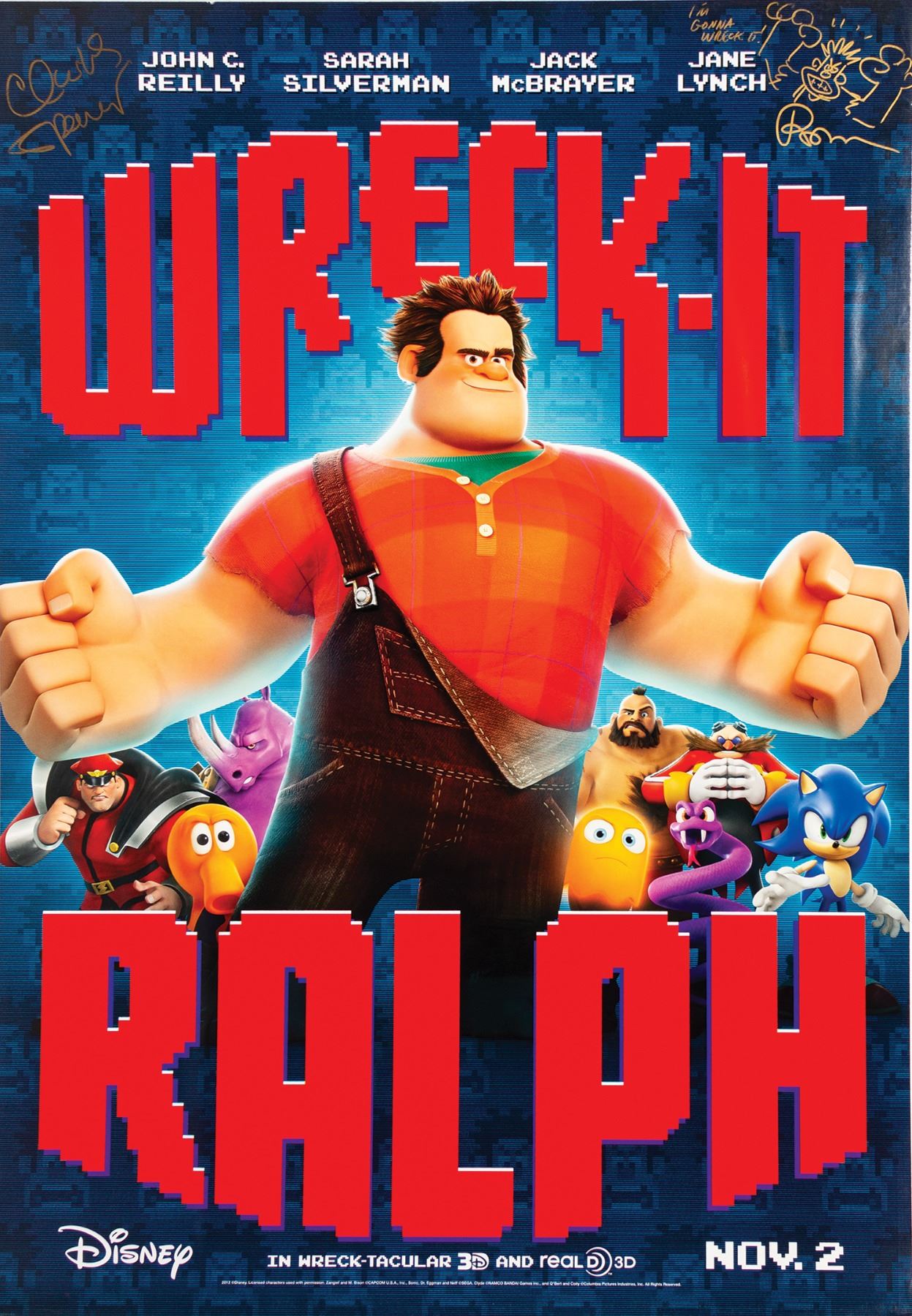 (Disney, 2012) An original one sheet poster for Wreck-it Ralph that is signed by producer Clark Spencer and director Rich Moore. The poster was used and signed at a Broadcast Film Critics Association event, and measures 40"x27". The poster is backed with foamcore and is in good to very good condition with some lifting from the board leading to bubbling, with some wear to lower left and right corners.