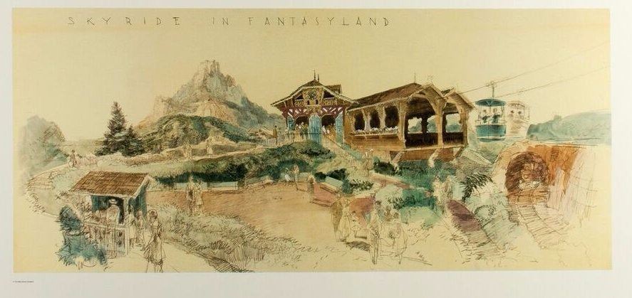 (Disneyland, c.2000s) A gorgeous lithographic print featuring concept artwork for the "Skyway" in Fantasyland by Imagineer Herb Ryman. This print was created specifically to be displayed at the Disneyland Hotel. This item measures 26"x40" with an image size of 14"x32.25", and is in very good condition with minor edge-wear.