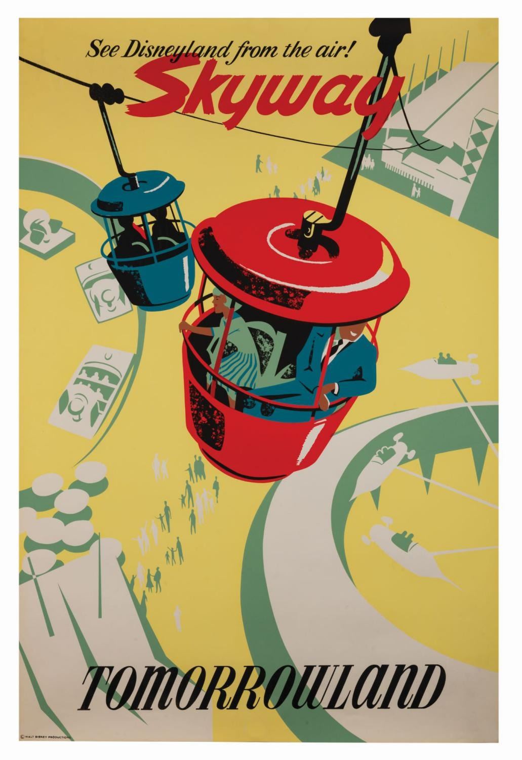 (Disneyland, 1956) A hand-silkscreened poster for the Skyway attraction. Designed by Bjorn Aronson, this poster features the Skyway overlooking several early Tomorrowland landmarks. Measuring 54"x36", the poster is in very good condition with minor wear, including a few small tears at the upper right edge. There is some striation to the color in the text of "Tomorrowland" and very minor bleeding to the ink from printing.
