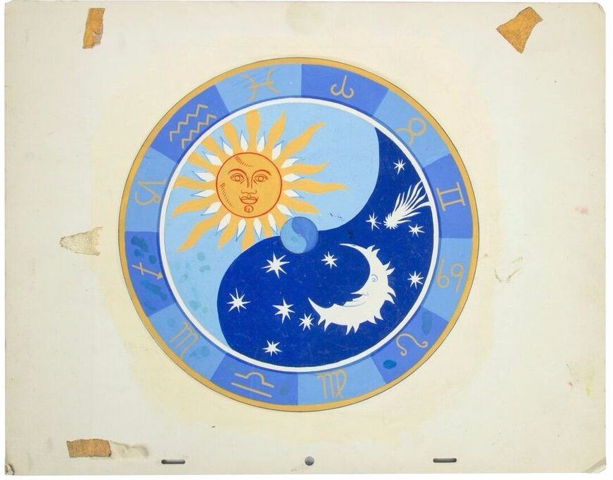 (Disneyland, 1956) An original concept painting for the celestial clock that adorned the Fantasyland "Skyway" entrance. Accomplished in gouache on artist's board, this painting features beautiful sun and moon imagery. This item measures 12.5"x15.5" and is in good condition with minor wear and staining from use.