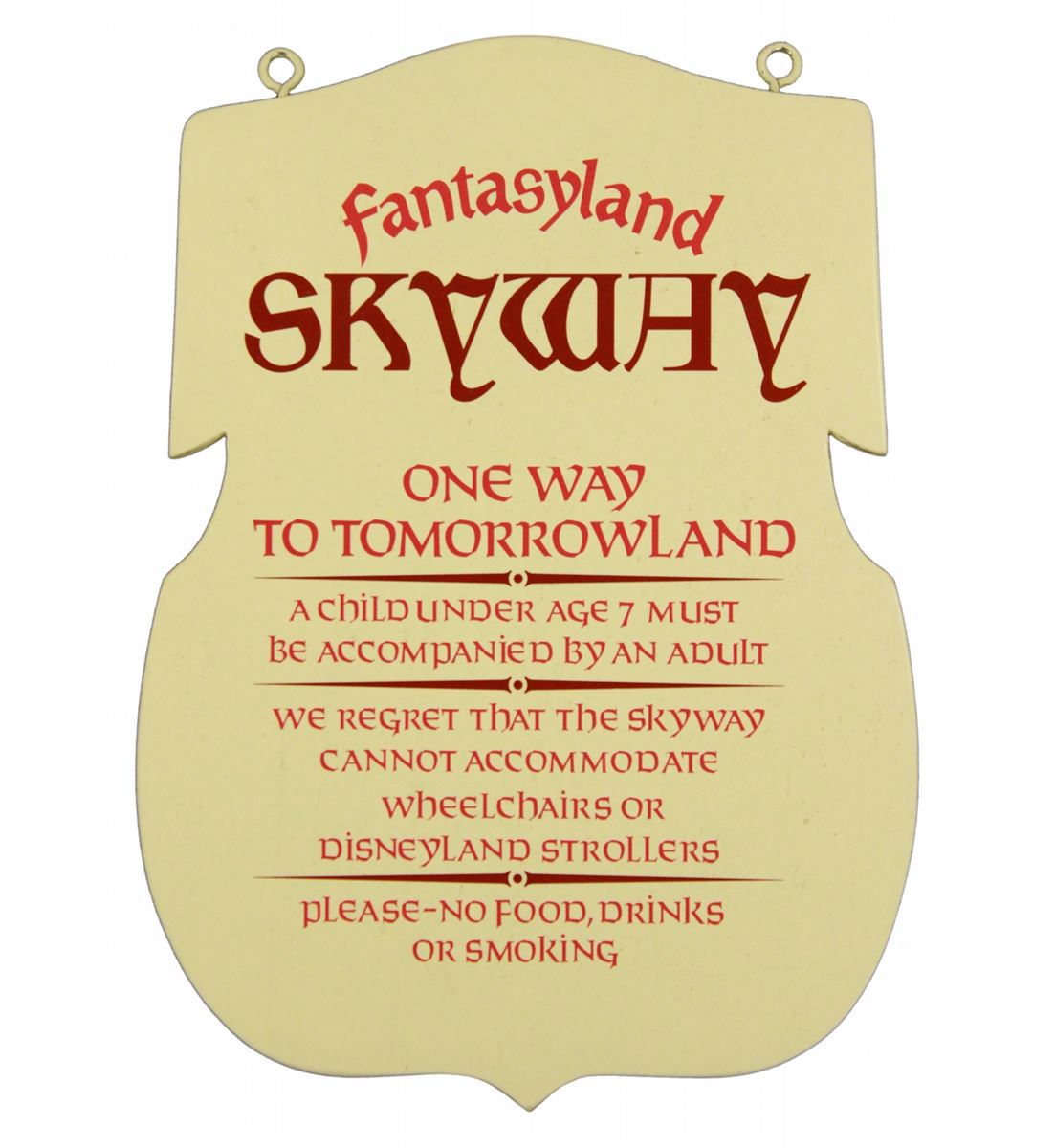 (Disneyland, 1960s) Beautiful hand-painted wooden sign that hung at the entrance to the Fantasyland Skyway station. Measuring 22 x 16 in. and in very good condition overall with some wear.