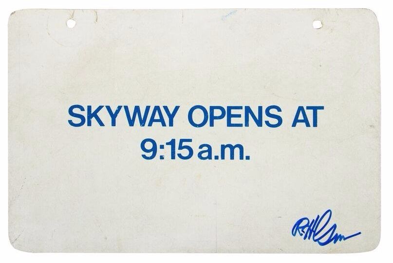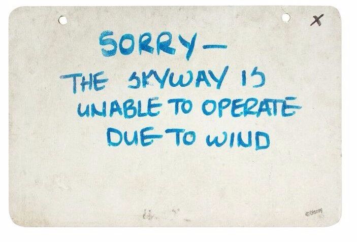 (Disneyland, c.1990) A very rare sign from the "Skyway" attraction announcing that the "Skyway Opens at 9:15am". The sign features Imagineer Bob Gurr's signature in the lower-right corner. Gurr famously designed the iconic four-passenger "Skyway" buckets in the mid-1960s. The back of the sign features the Disney copyright as well as a handwritten message so that when the sign is turned around, it reads, "Sorry - The Skyway is Unable to Operate Due to Wind". This sign measures 8"x12" and is in good condition with some wear throughout from extensive park use.