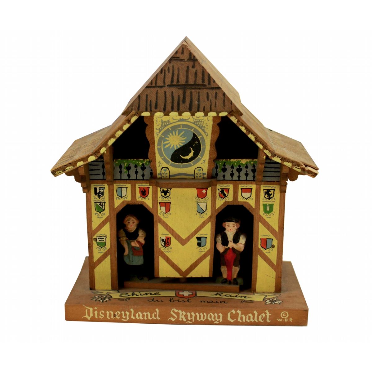 (Disneyland, 1956) An extremely rare memento of the, Skyway chalet stationhouse from the now extinct Skyway attraction. For it’s opening in 1956, these hand-made wooden chalet houses were offered for sale at souvenir kiosks in Fantasyland as well as the Disneyland mail order catalogs. Featuring a crude barometer, the cuckoo-clock type figures would ‘predict’ forthcoming rain or shine. A very charming representation of the chalet design itself, including an image of the celestial clock .The entire piece measures 5 x 2.75 x 5.5 in. In very good condition with slight wear throughout.