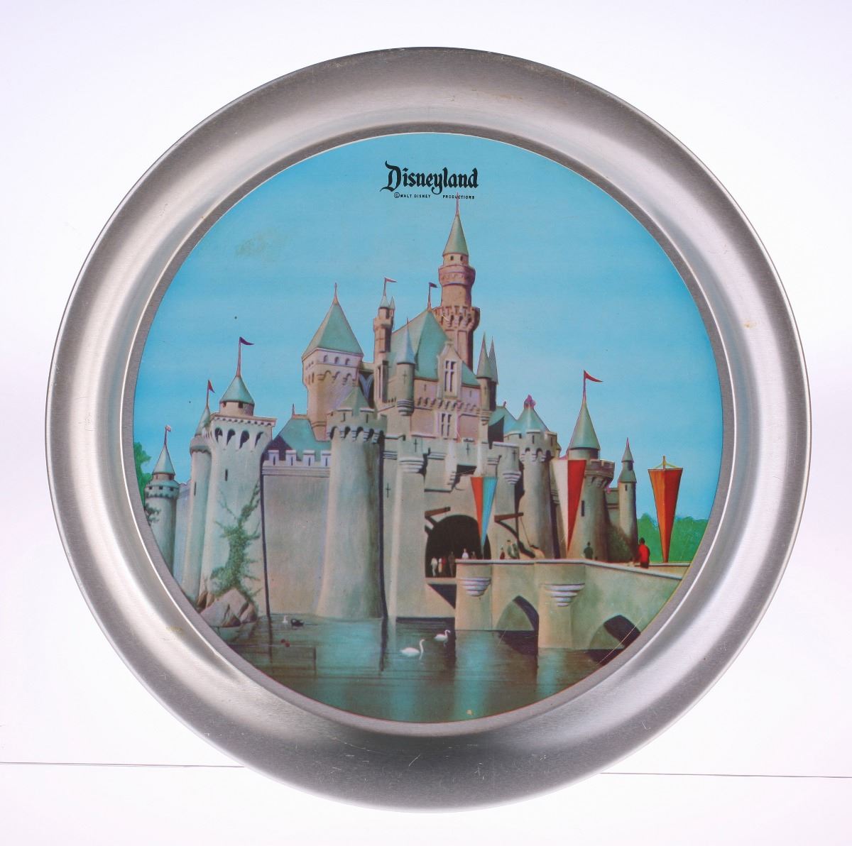 (Disneyland, 1950s) Features colorful Sleeping Beauty Castle imagery. Measures 11" in diameter and 0.75" tall. In good condition with minor wear.