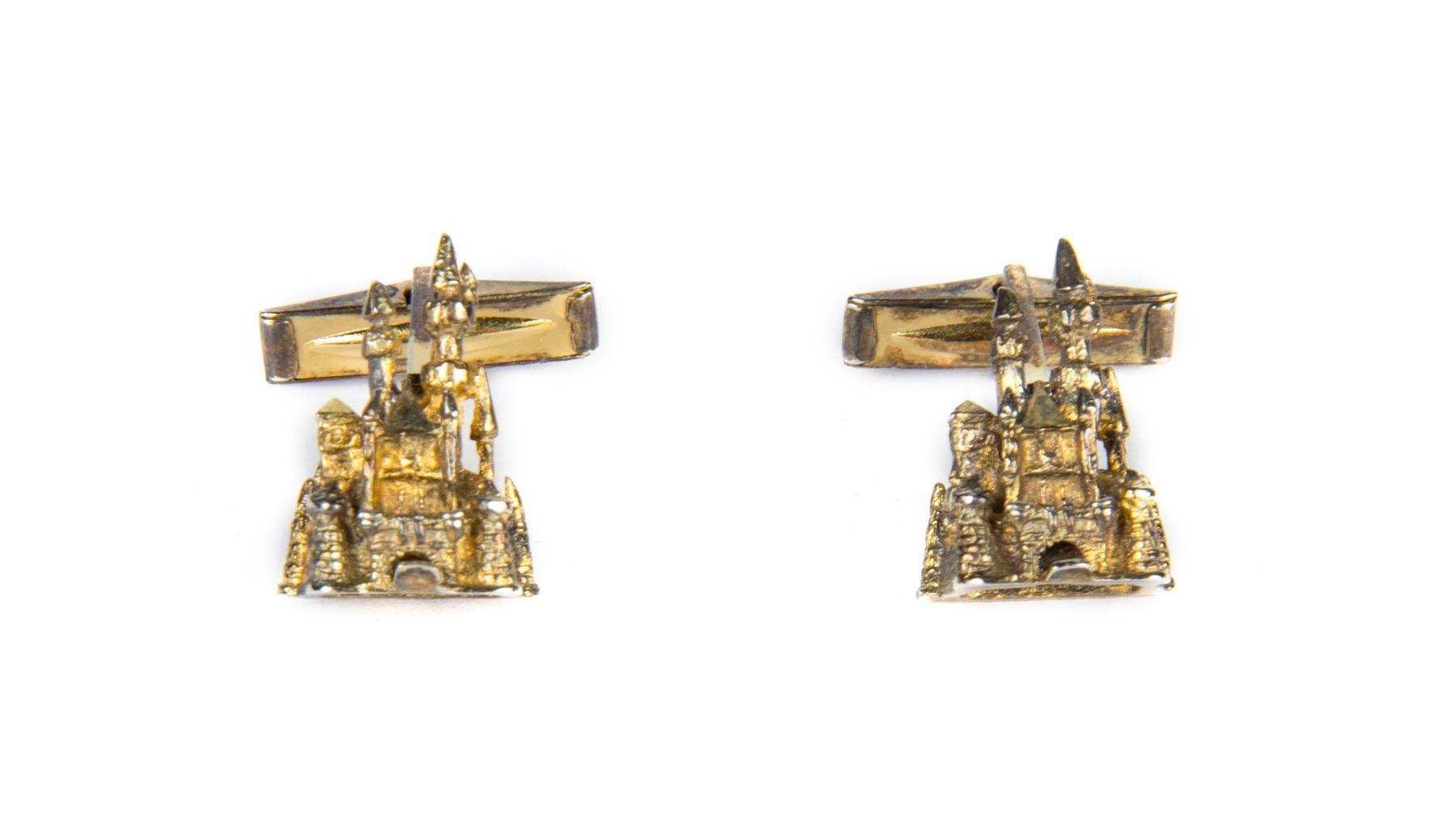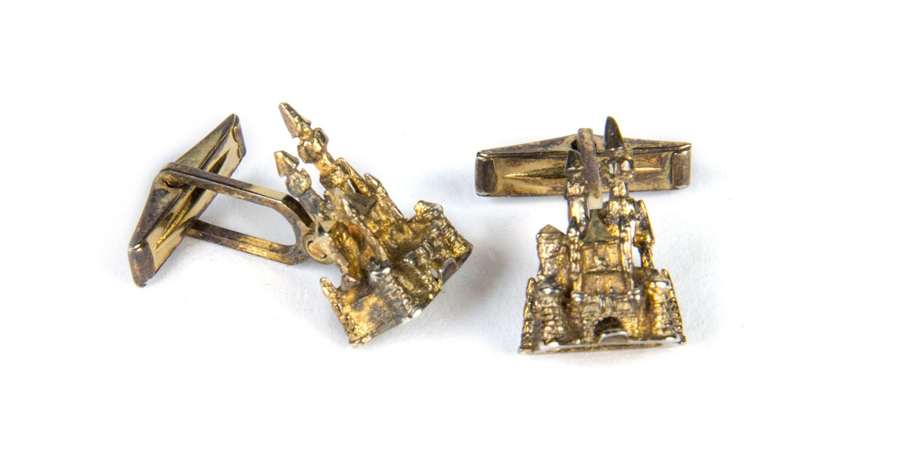 (Disneyland, c.1960s) A pair of Sleeping Beauty Castle cufflinks. These fashionable souvenirs from the early years of the park are both visually appealing and functional. The back sides of the cufflinks are marked "sterling", with the castle portion of both cufflinks measuring 0.75" tall. The condition is very good with some wear from use.