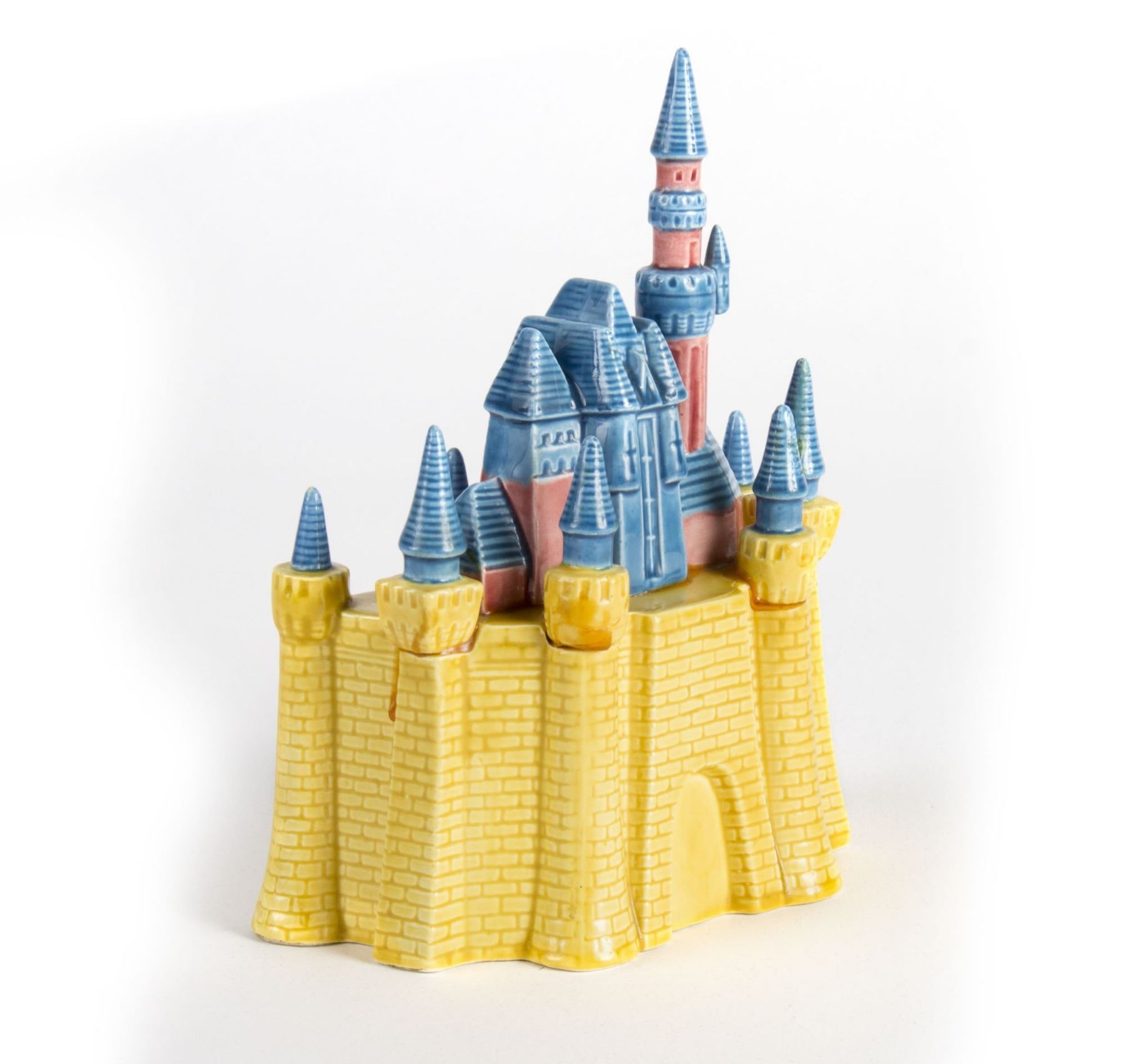 (Disneyland, c.1960s) A ceramic bank modeled after Disneyland's "Sleeping Beauty Castle". The bank measures 8" tall and is in good condition. Several sections along the top-half of the castle were glued into place during the construction of the bank. In several spots, some of this adhesive residue can be seen, but it appears to be a production flaw as opposed to a repair.