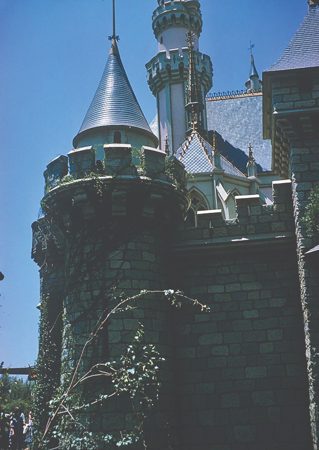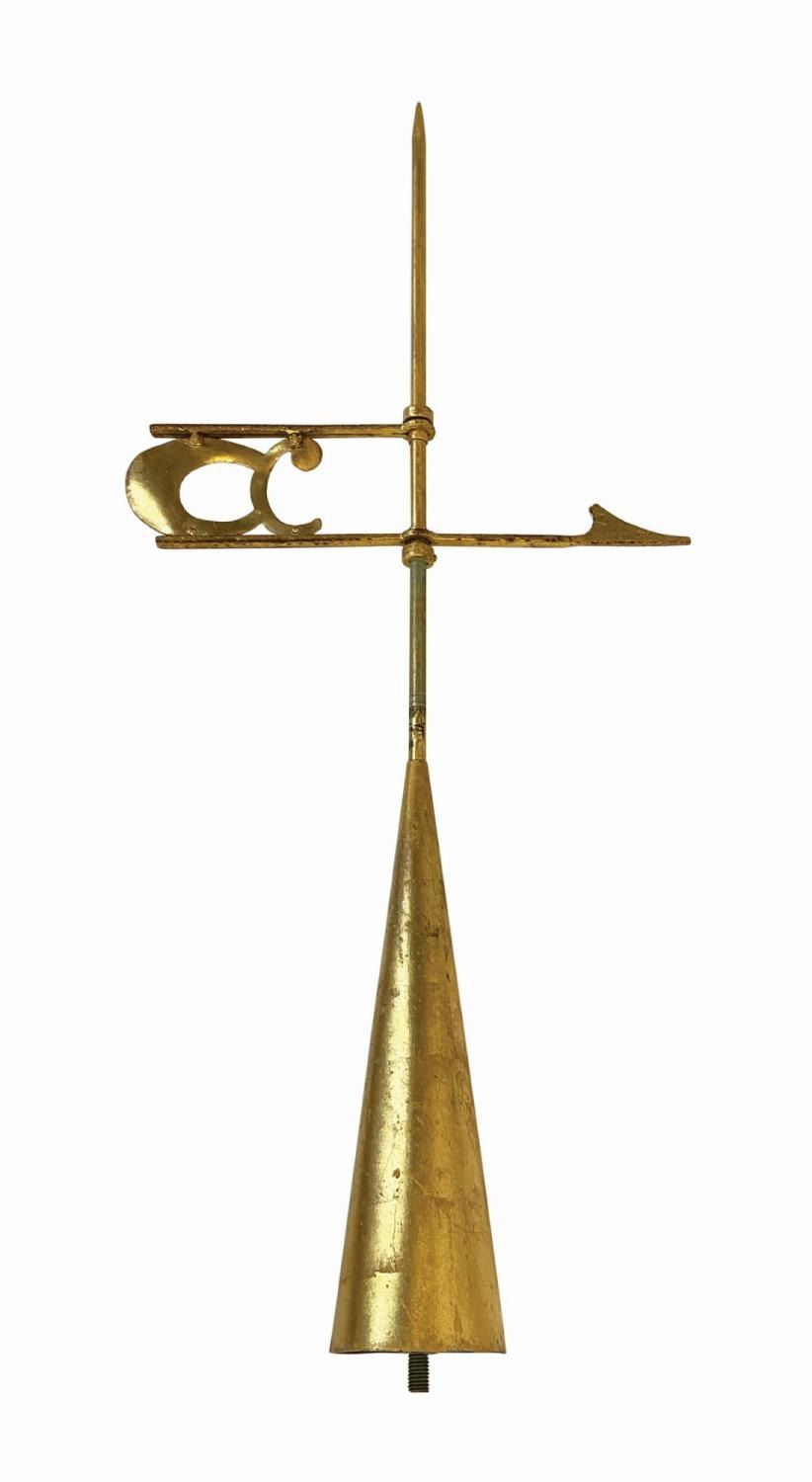 (Disneyland, c.1960s-80s) A remarkable original weathervane from a spire atop Disneyland's Sleeping Beauty Castle. Composed entirely of metal, the weathervane arms are attached to a pointed spire that runs through the hollow conical spire cap. A very stylized monogram "D" is joined to the upper and lower arms of the vane, so that the emblem would appear as a "D" regardless of which direction it was viewed from. The bottom arm extends into an arrow, which indicates the direction of the wind. The spire post is threaded at the bottom and includes nuts and bolt hardware for attachment to the castle. The piece is coated in a mix of both metallic gold paint and actual gold leaf. During construction of the park, Walt insisted the precious metal be used to embellish the spires of the castle in order to lend the structure a cinematic sparkle. According to legend, when the more pragmatic and money-conscious Roy Disney found out about his brother's extravagance, he refused to speak to Walt for a month. This weathervane was previously installed on the castle's second-tallest tower, atop the larger of the double turrets. Here it was viewed by millions of park guests as they ventured into the inner regions of the park during Walt's era. Measuring 42"x17.5" and 4" deep, the piece is in good condition with some paint loss, oxidation, and weathering from outdoor use. Since the park opened in 1955, Sleeping Beauty Castle has been the primary symbol of Disneyland, its glimmering spires heralding a world of immaculately constructed fantasy. So too, this gold leaf coated spire cap and weathervane are emblematic of Walt's singular commitment to an artistic vision that made the park experience possible.