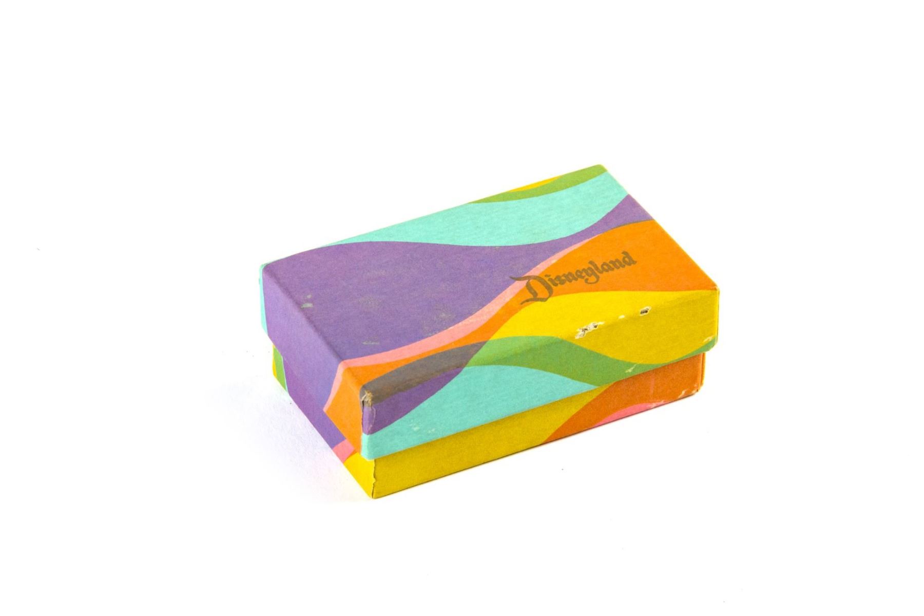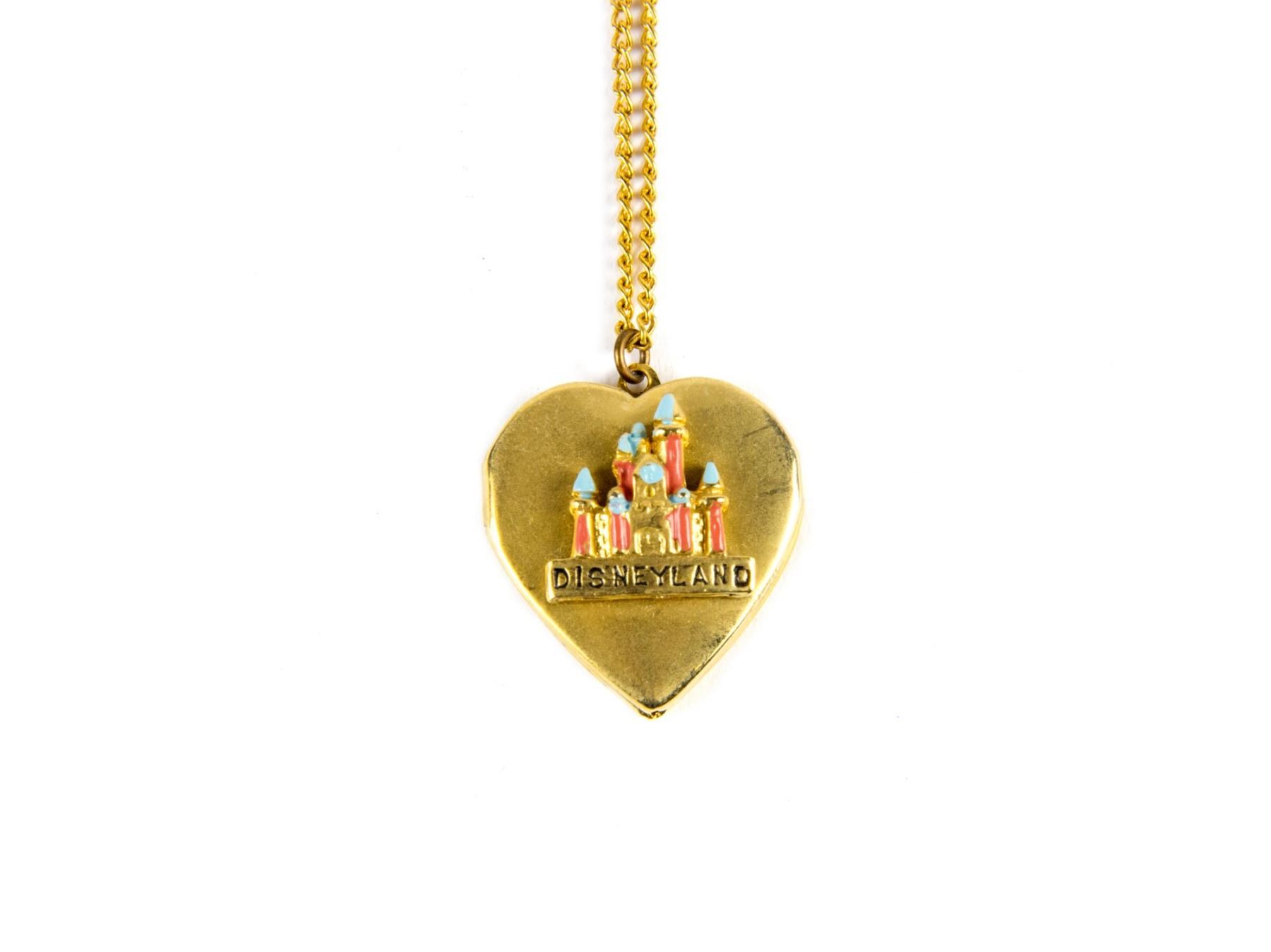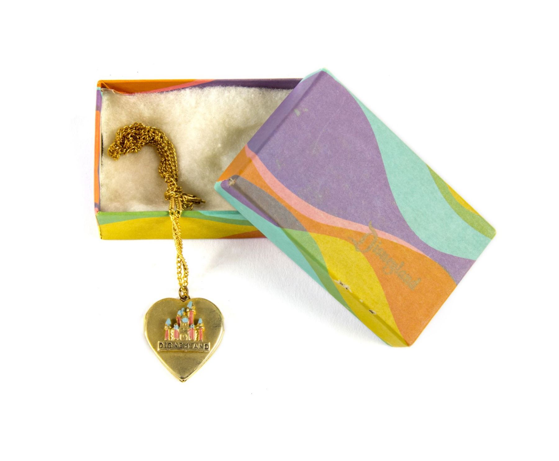 (Disneyland, 1960s-70s) A colorful clasping souvenir locket in its original small Disneyland box. The metal locket features a small Sleeping Beauty Castle charm adhered to the front above the word "Disneyland". Measuring 1.25"x1" with an 18" chain, the locket is in very good condition with minor wear from use. The decorative box reads "Disneyland" on the lid and measures 2"x3" and 1" thick.