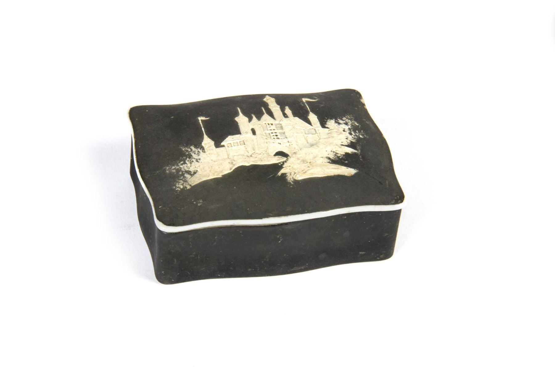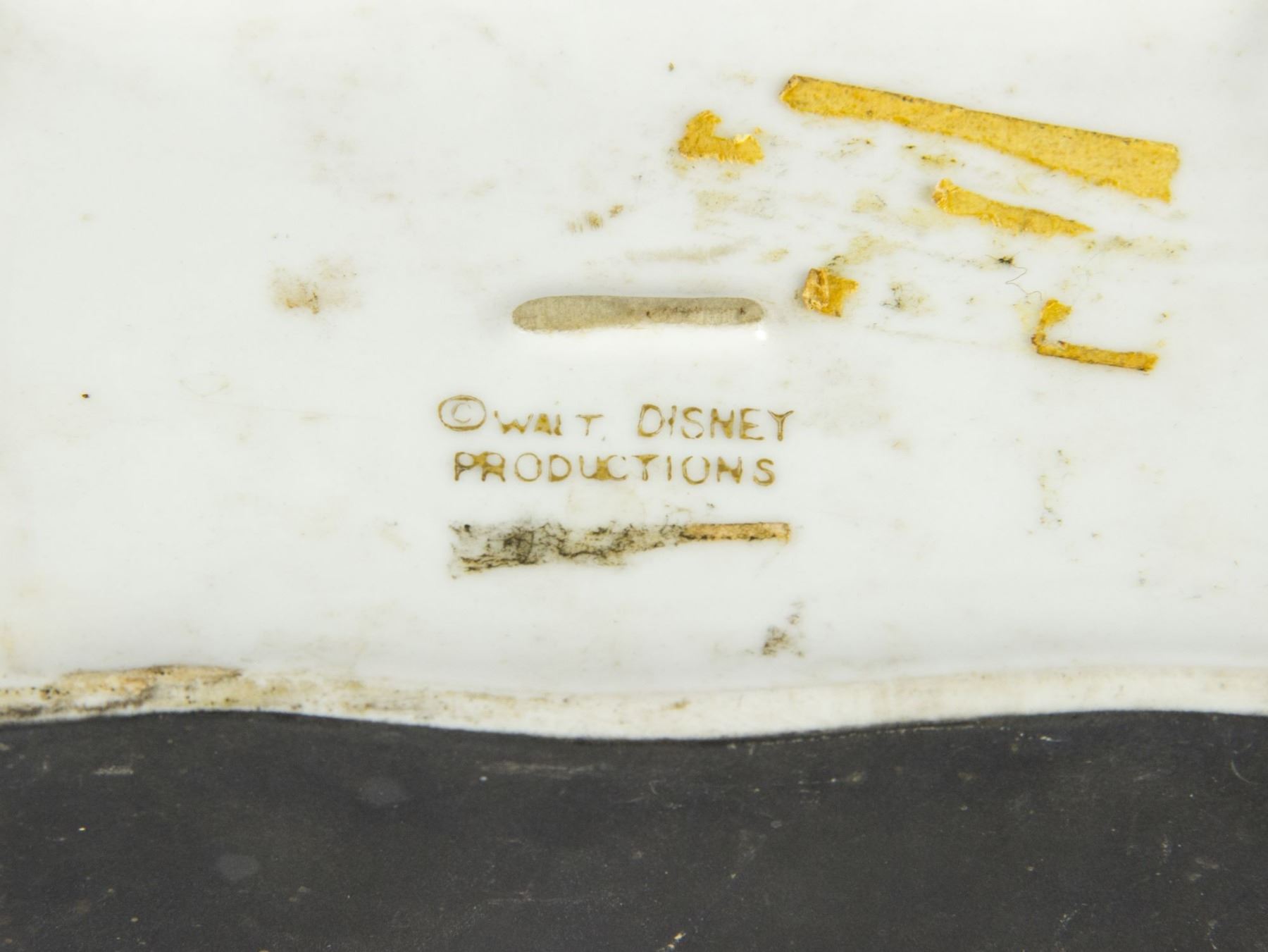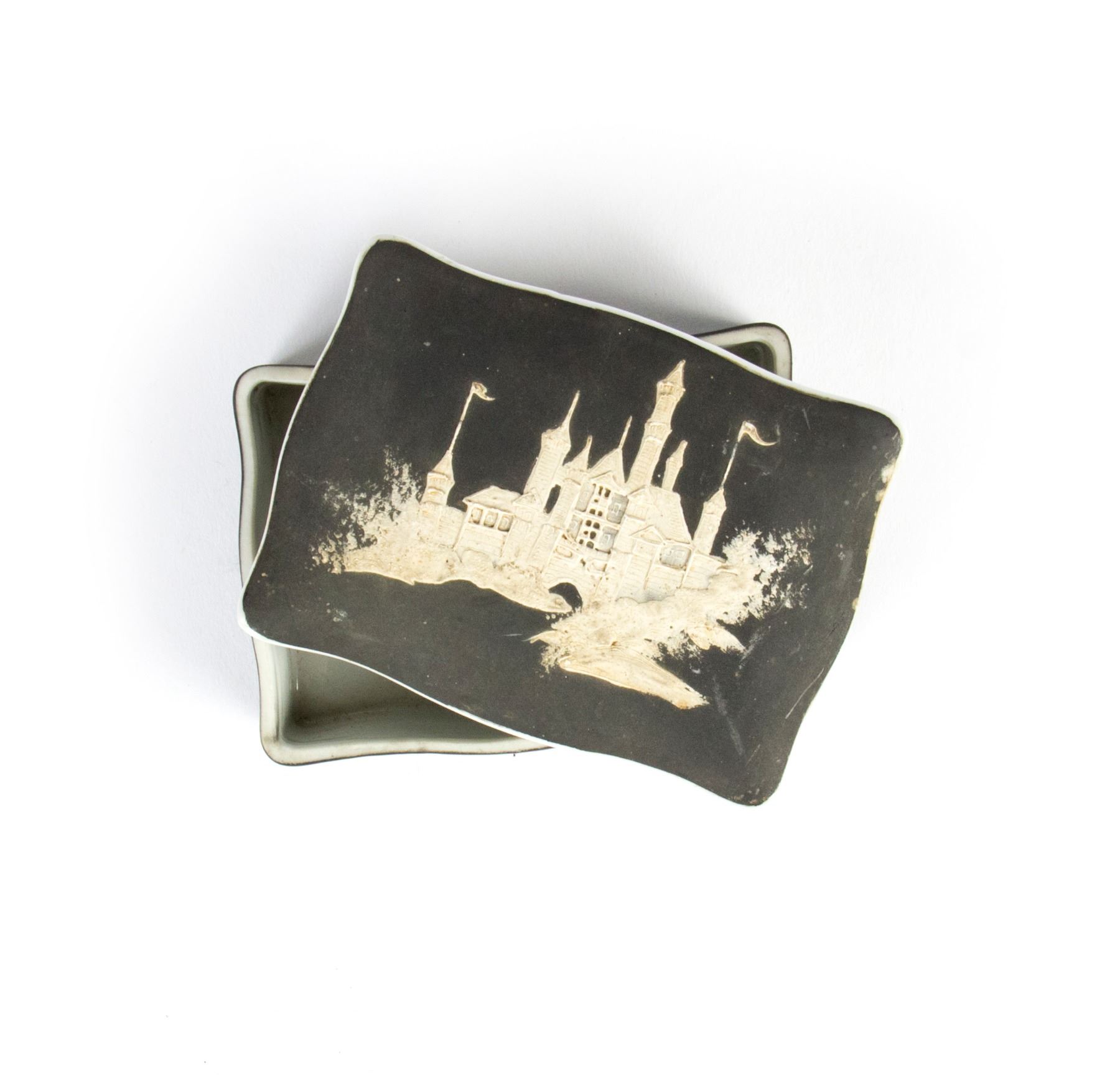 (Disneyland, 1960s) A black and white ceramic trinket box featuring a soapstone Sleeping Beauty Castle on the lid. The trinket box was created in a very unusual color choice for the park, and represents some of the more unique early Disneyland souvenirs. Measuring 3.5"x4.75" and 2" tall, the box is in fair to good condition with some wear to the Castle.