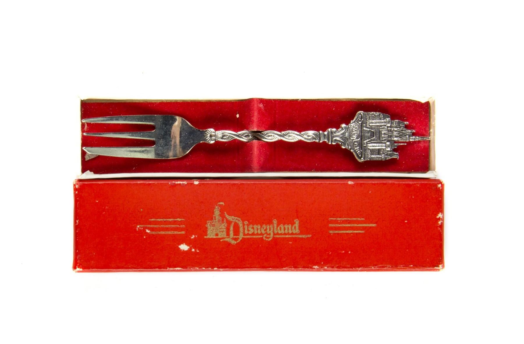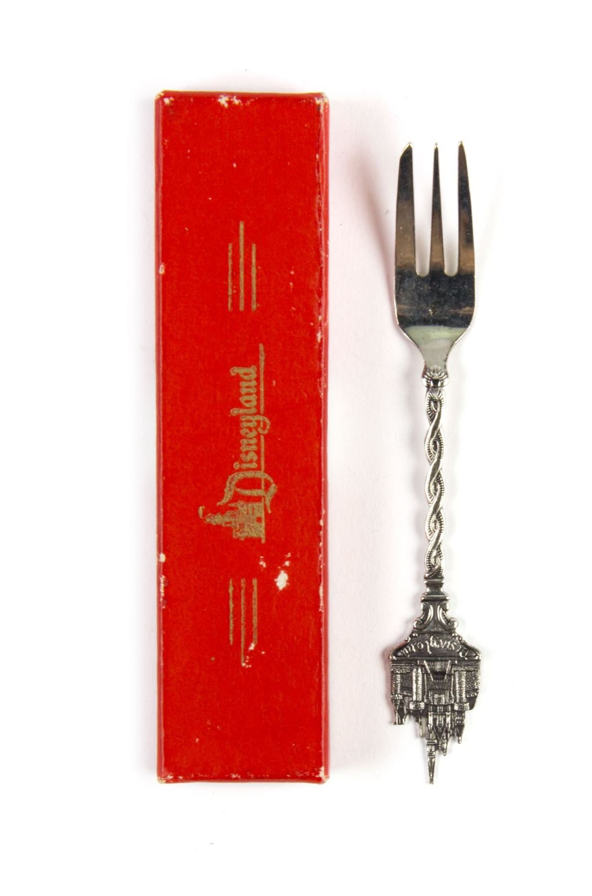 (Disneyland, c.1960s) A souvenir Sleeping Beauty Castle fork from Disneyland in its original box. The red box and the fork's handle both read "Disneyland" with imagery of the castle. The fork measures 5.25" long and is in very good condition.