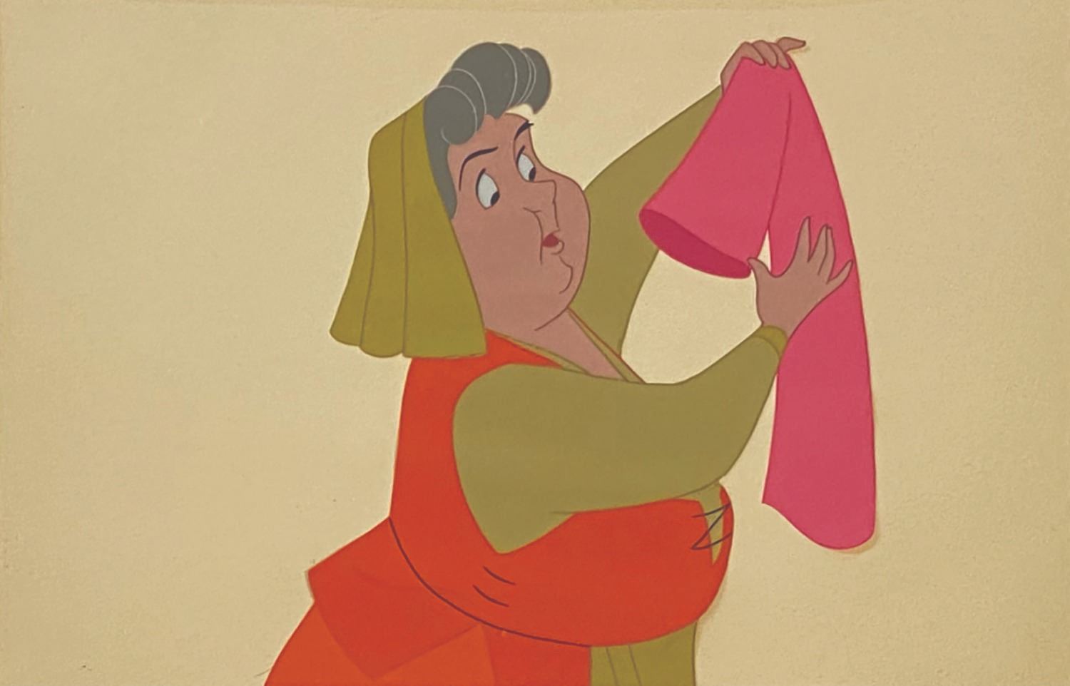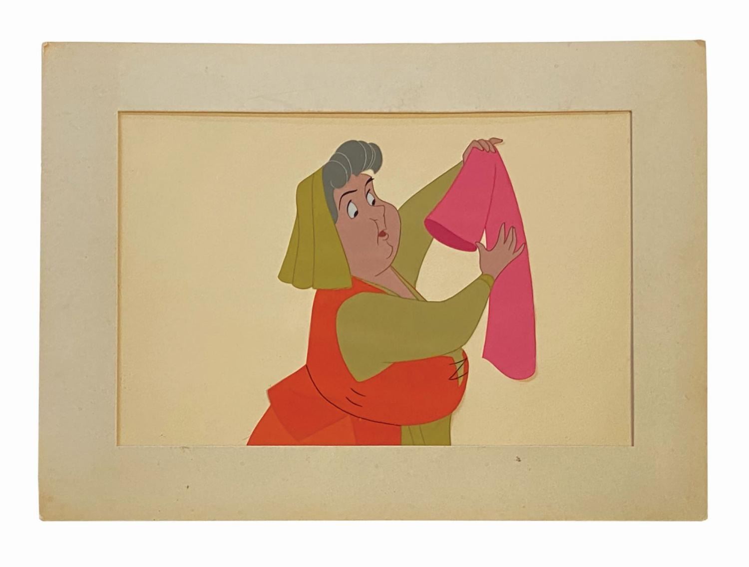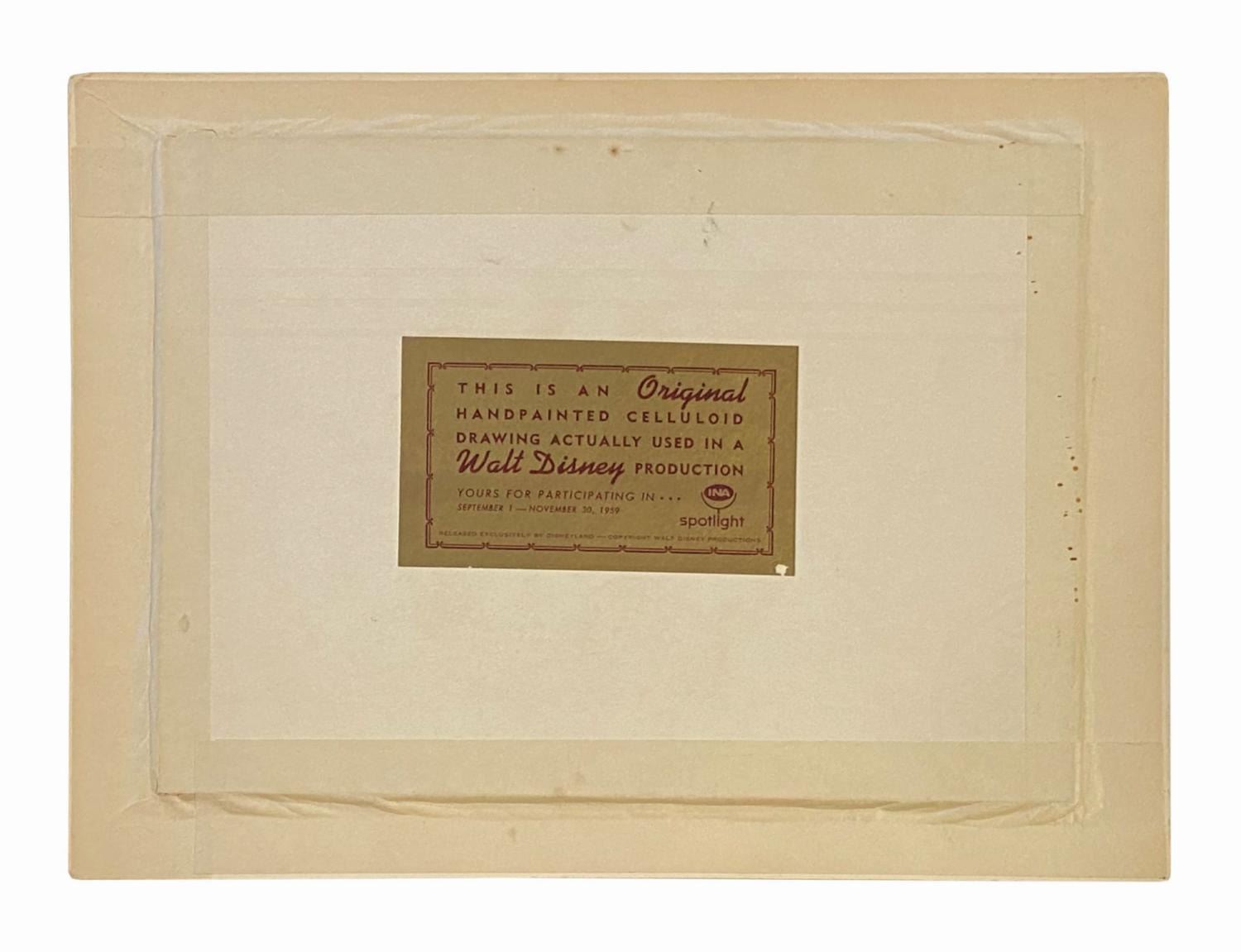 (Disney, 1959) An original production cel depicting Flora with the sleeve of Briar Rose's birthday dress from the Disney animated classic, Sleeping Beauty. The cel was trimmed and prepared for sale by the Art Corner in Tomorrowland, and remains mounted to its original backing board with a gold Art Corner label on the reverse. Measuring 6.25"x9" visible through the mat opening with an image size of 5.75"x5.25", the piece is in very good condition with two spots of outline lifting in Flora's sleeves and some surface wear to the sheet. The mat exhibits age discoloration, spot soiling, and corner bumping.