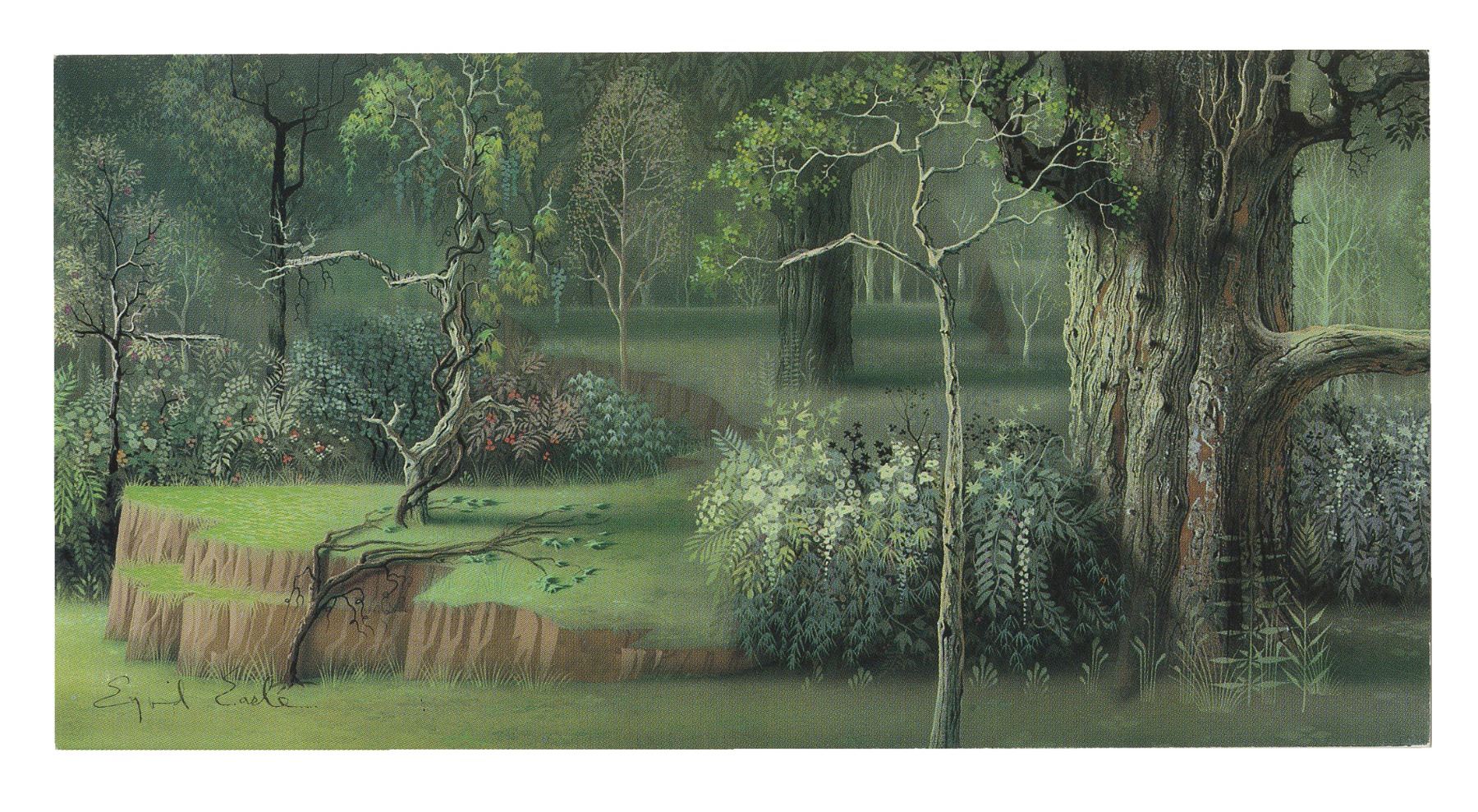 (Walt Disney World, 1989) An elongated postcard featuring breathtaking artwork by Eyvind Earle for the feature film Sleeping Beauty. This postcard was created for the grand opening of Walt Disney World's Animation Gallery in 1989, which also coincided with the 30th anniversary of this iconic animated film. Earle signed the front of the card in the lower-left corner. Measuring 3.5"x7", the card is in very good condition with minor wear around the edges.