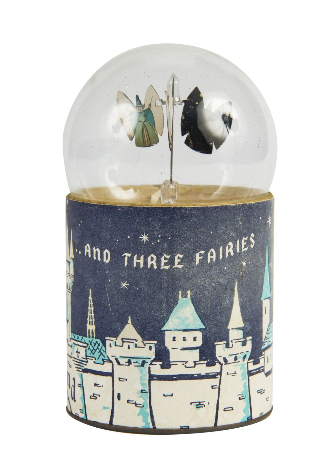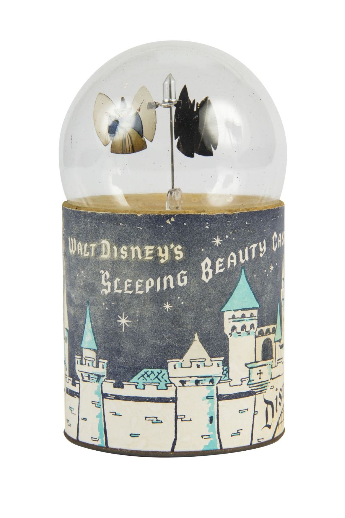 Sleeping Beauty" and features imagery of Disneyland's Sleeping Beauty Castle along the base. Sunlight causes the spinning figures of the Three Fairies, Flora, Fauna, and Merryweather, to rotate. Measuring 3.25" in diameter and 5.5" tall, the condition is good with some surface wear from use.