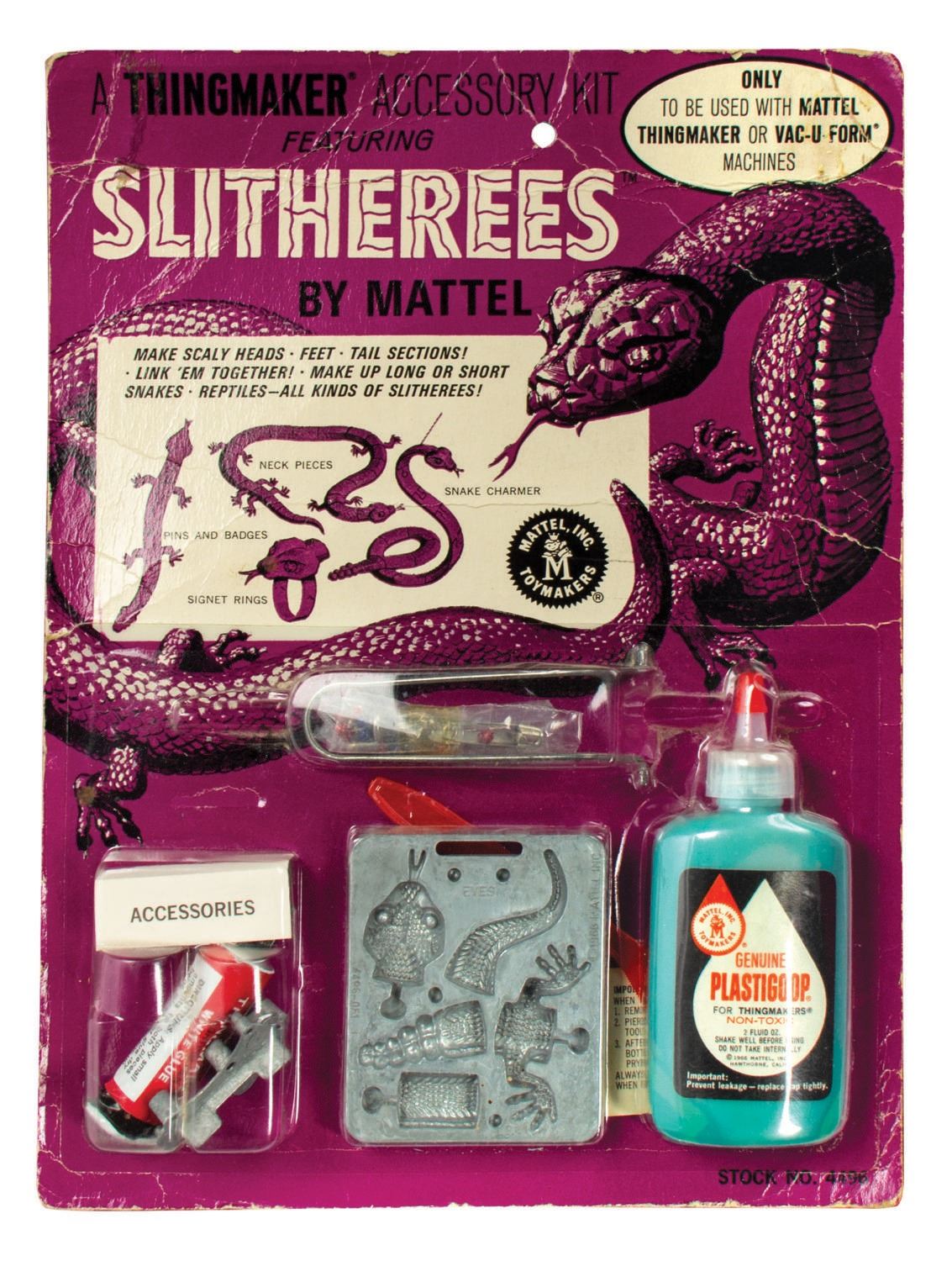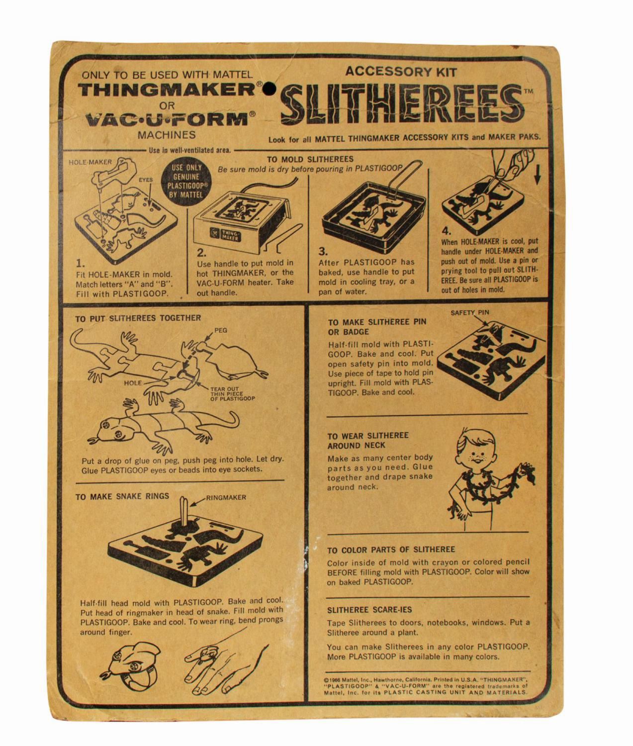 (Mattel, 1966) A vintage Slitherees Accessory Kit for use with the Thingmaker or Vac-U-Form machines manufactured by Mattel. Never opened, all items are inside the original plastic bubble, which is still attached to the original backing card (the plastic knife has migrated from its original slot). Measuring 12"x9" and 1" deep, the card is in good condition, exhibiting moderate creasing to the upper half and lower right corner. The contents are virtually as-new with only minor signs of aging.