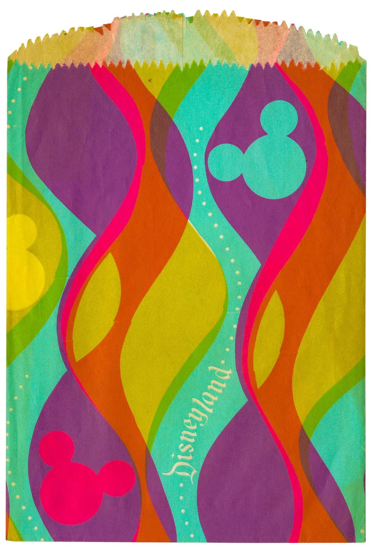 (Disneyland, 1960s-70s) A colorful shopping bag from Disneyland in a style used during the late 1960s to early 1970s. The Mickey-ears pattern with "Disneyland" text throughout is one of the more recognizable Disneyland shopping bag designs used throughout the years, and would have come in a variety of sizes to be used for the park's wide assortment of souvenirs. Measuring 8.5"x5.5", the bag is in very good condition with minor wear from use.
