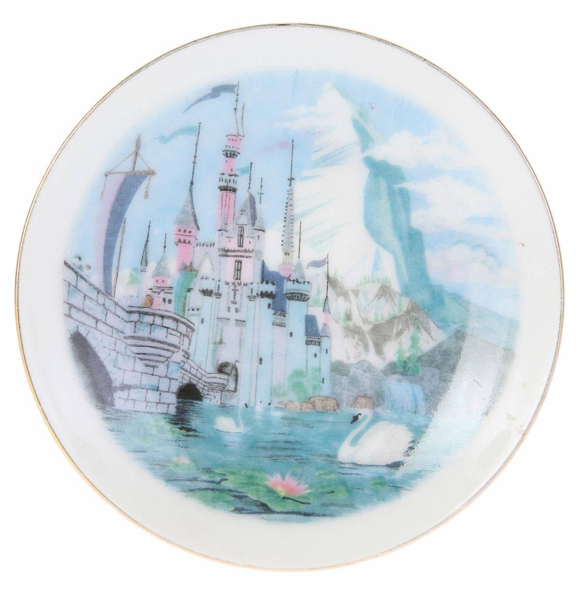 (Disneyland, 1950s) Small decorative plate featuring Sleeping Beauty Castle imagery. Measures 4" in diameter and 0.6" tall. In good condition.