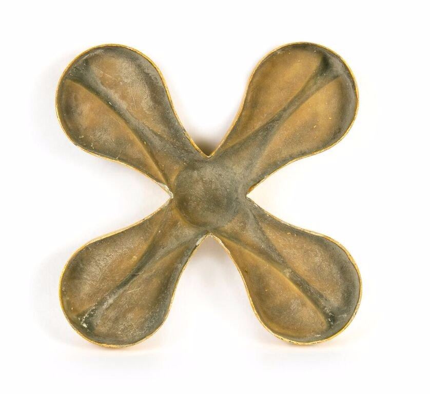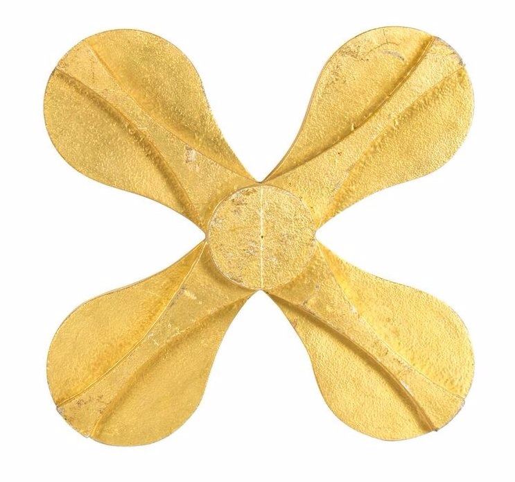 (Disneyland, c.1970s) A charming gold-painted fiberglass flower prop from the facade of the "It's a Small World" attraction at Disneyland. According to a souvenir book printed in 1973, this flower prop was painted with actual 22 karat gold-leaf. The section states, "for weather durability and unexcelled beauty, 22 karat gold-leaf was used for trim throughout the facade. When domestic supplies of gold leaf ran low, Disney engineers secured a European shipment to finish the job, thus adding another "international" touch while creating a striking contrast of gold textures". This flower prop would rotate along with the other moving parts of the "Small World" building. This item measures 15"x15" and 2" thick, and is in good condition with some scuffing from use.