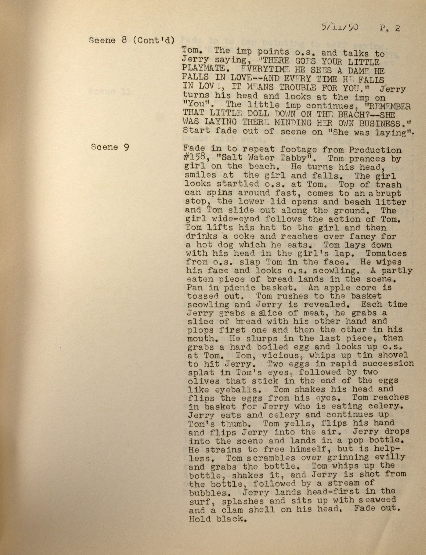 (MGM, 1950) An original file copy script for the Tom and Jerry short "Smitten Kitten." The short featured Tom falling in love and Jerry recalling all of his ill-fated love affairs in the past using footage from previous shorts, and was directed and developed by Hanna and Barbera. The script is marked as a "File Copy" and dated 5-11-50, although the short was not released until 1952. Measuring 11"x8.5", the script is in very good condition with some edge-wear from age and use, as well as a few spots of discoloration on the front and reverse.
