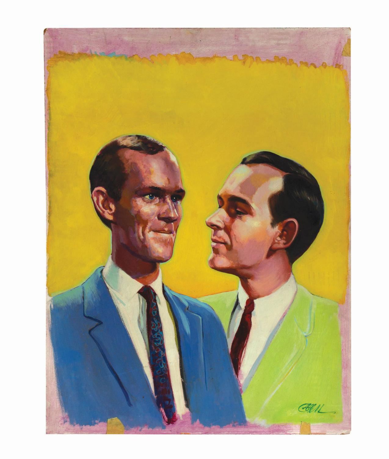 (Esquire, c.1970) An original painting depicting the American folk singers Tom and Dick Smothers, best known by their performing name the "Smothers Brothers." Despite their clean cut look and act, their variety show, The Smothers Brothers Comedy Hour, became quite controversial as the brothers often spoke out against the Vietnam War, resulting in the loss of their show in 1969. This artwork was created by Green for an article in Esquire magazine which depicts the clean cut brothers, and was paired next to an additional illustration by Green of the brothers depicted as hippies. Accomplished in oils on sturdy board, the painting measures 24"x18" and is in very good condition with some paint wear and small chips to the edges of the board. There are a few small pieces of tape around the edges, and Green has signed the bottom-right corner.