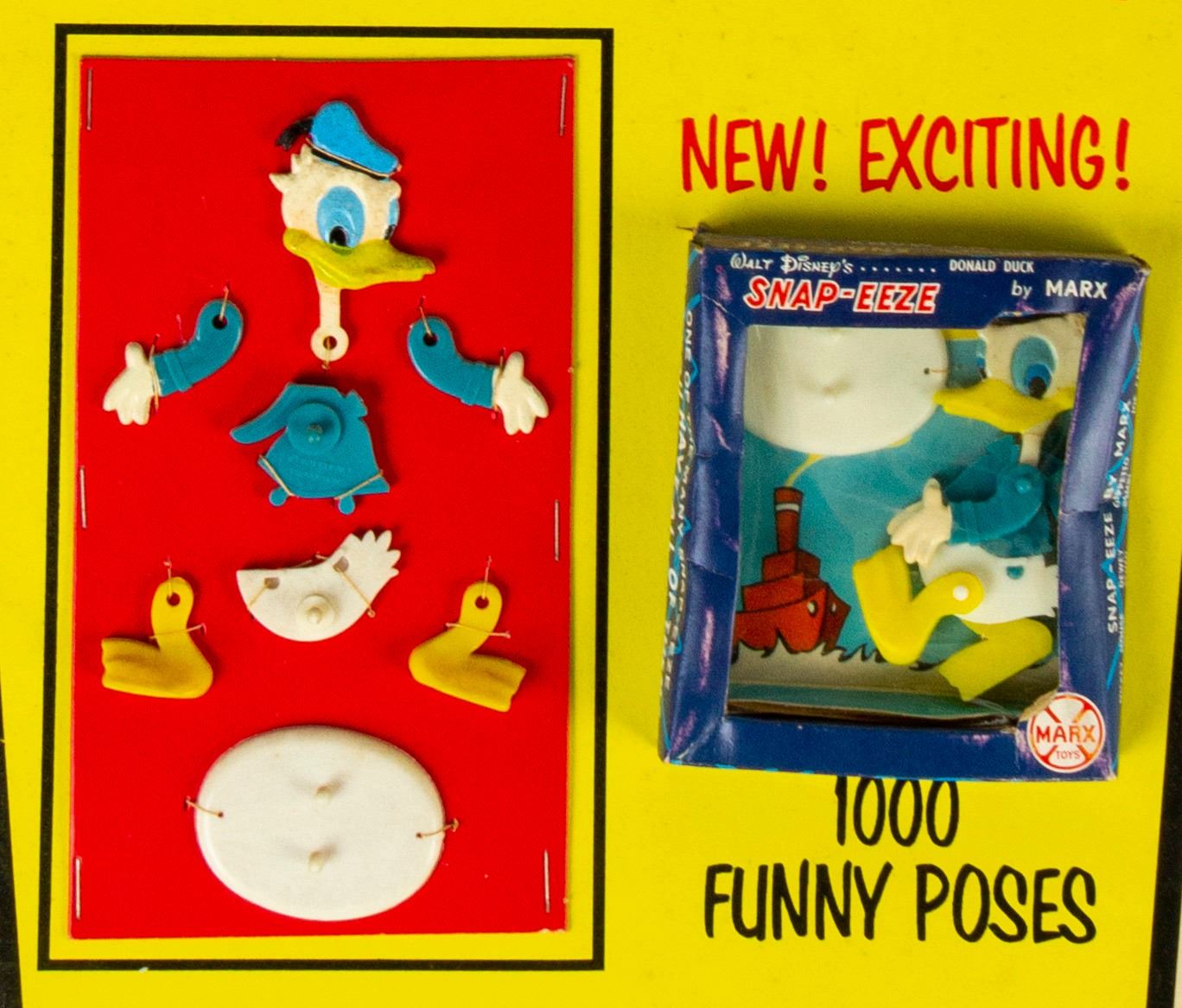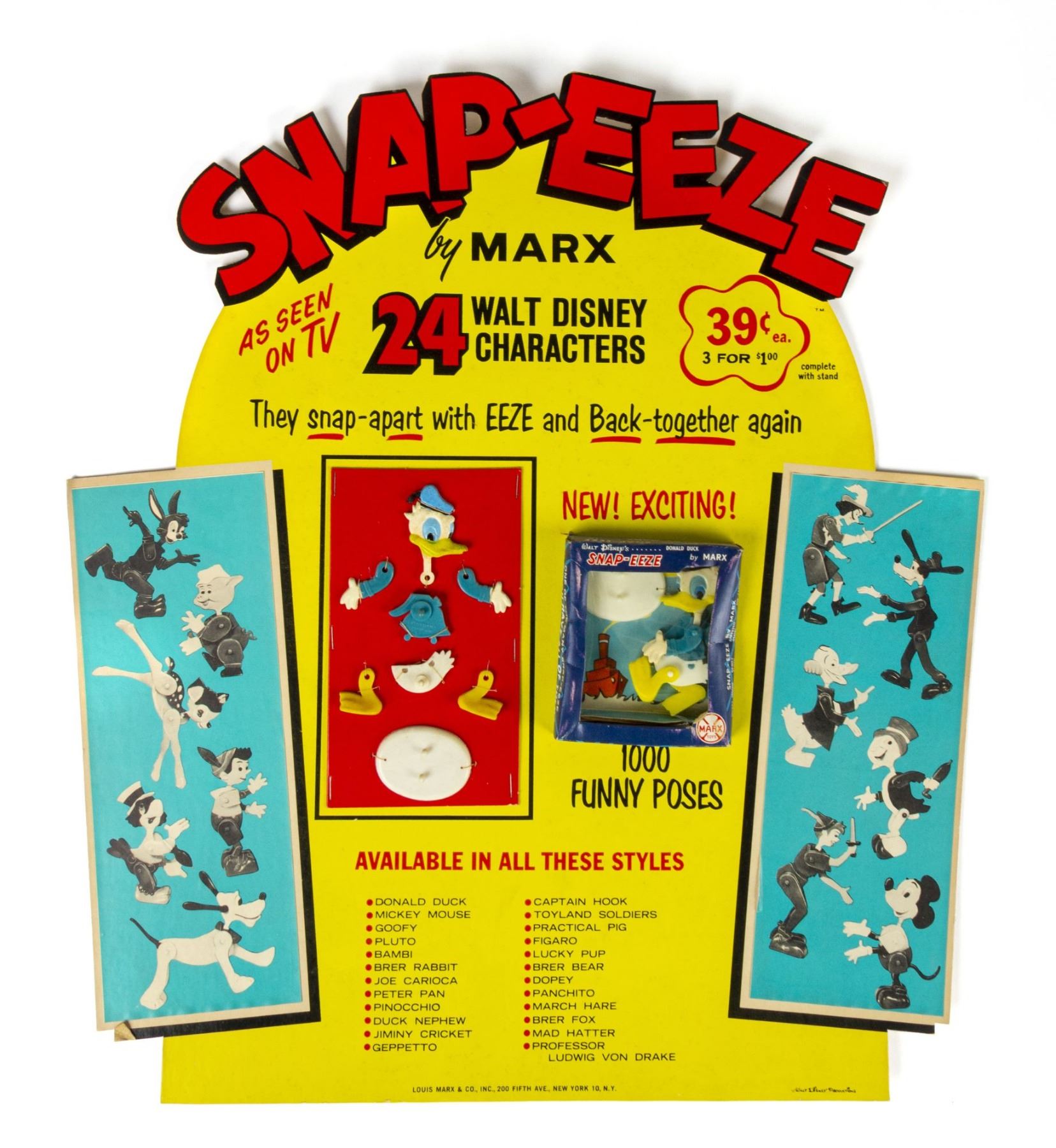(Marx, c.1960s) An incredibly rare store display for Marx's Snap-Eeze toys. The display features one Donald Duck Snap-Eeze toy disassembled to demonstrate how the figure functions, and a second still in the box. Measuring 21"x19.25", the display comes in its original box which is 20"x21.5" and 1.25" deep. The display is in very good condition, with some expected wear from age including some peeling at the edges. The box is in good condition as well, with some discoloration from age and expected wear.