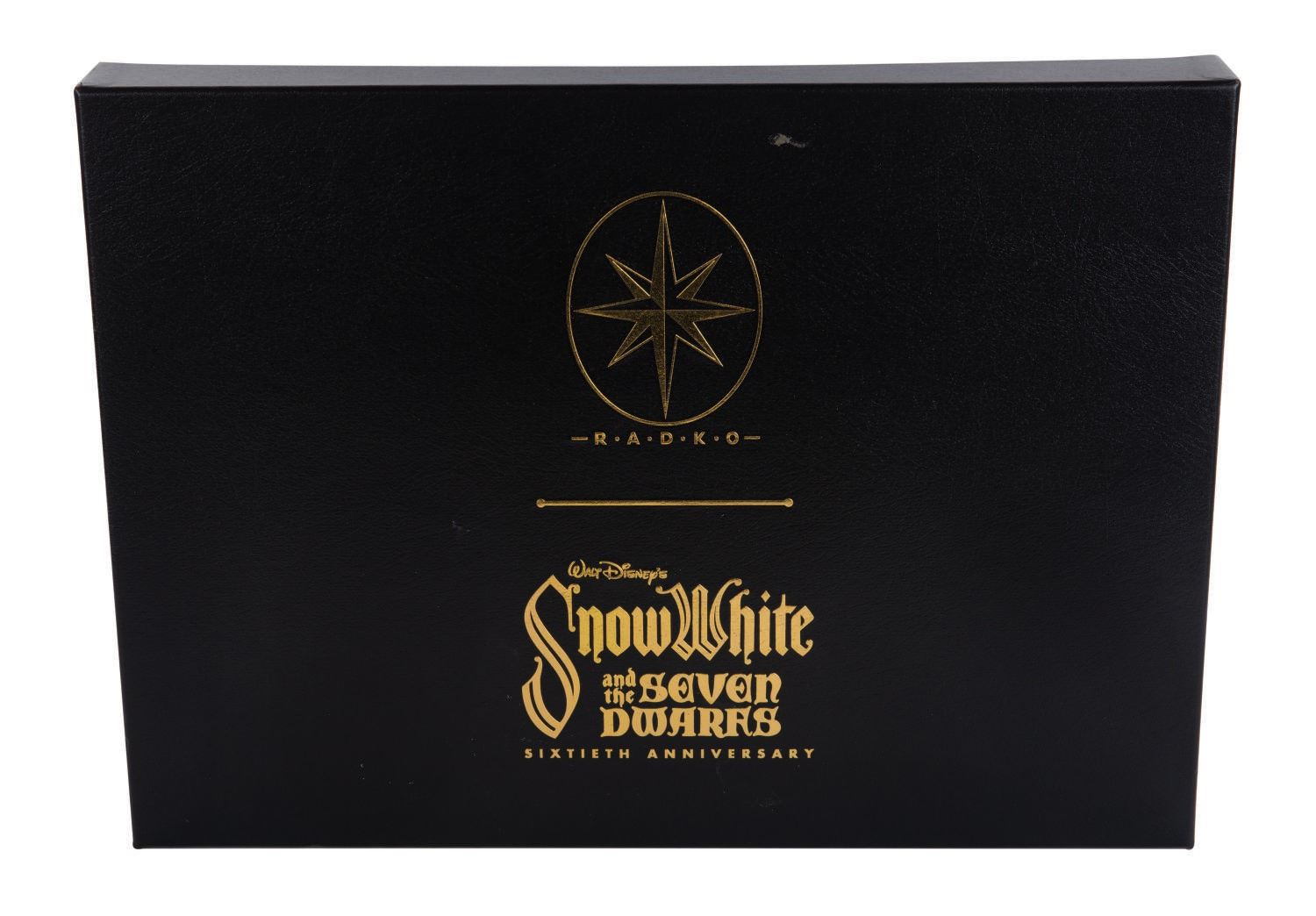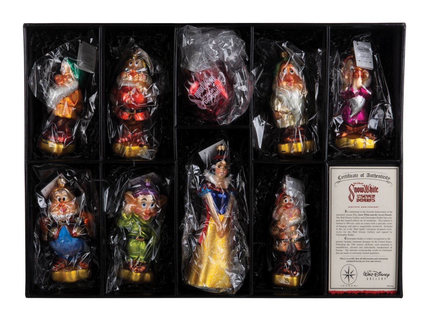 (Christopher Radko, 1997) A "Walt Disney's Snow White & the Seven Dwarfs" ornament set by Christopher Radko, created in honor of the 60th anniversary of the film. The limited-edition set features the Disneyland exclusive "Red Apple" ornament signed by Christopher Radko. Measuring various sizes under 9", the handblown, silvered and individually hand-painted ornaments are in very fine condition, in their original box, exhibiting the slightest wear to the lid. (Christopher Radko, 1997) A "Walt Disney's Snow White & the Seven Dwarfs" ornament set by Christopher Radko, created in honor of the 60th anniversary of the film. The limited-edition set features the Disneyland exclusive "Red Apple" ornament signed by Christopher Radko. Measuring various sizes under 9", the handblown, silvered and individually hand-painted ornaments are in very fine condition, in their original box, exhibiting the slightest wear to the lid.