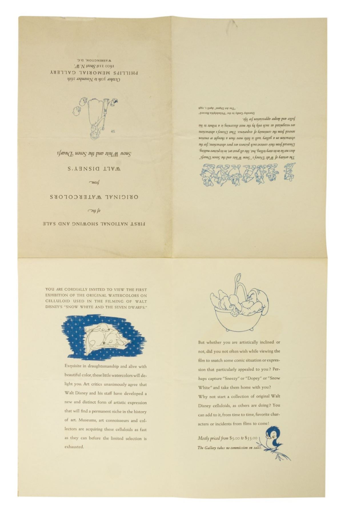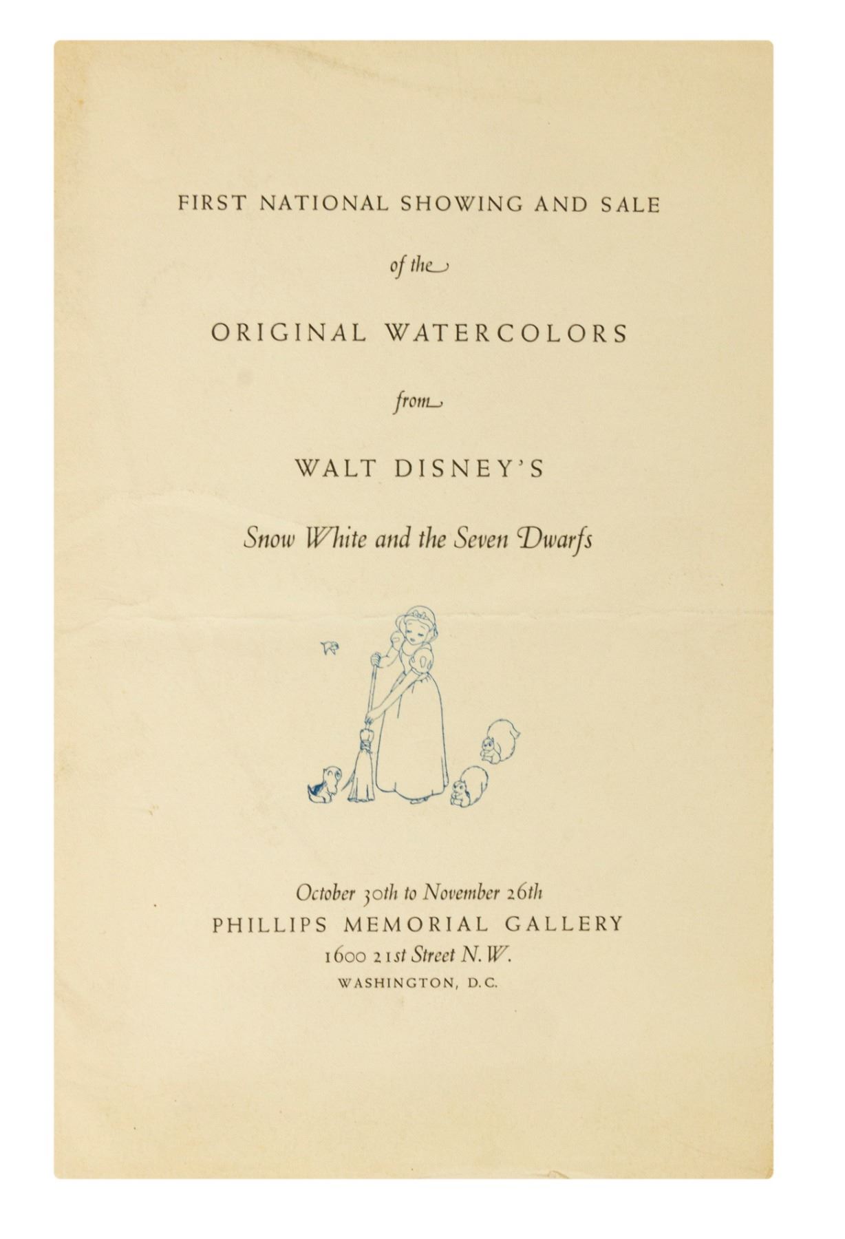 (Walt Disney Studios, 1938) An extremely rare invitation to the "First National Showing and Sale of the Original Watercolors from Walt Disney's Snow White and the Seven Dwarfs." The exhibit took place at the Phillips Memorial Gallery in Washington, D.C. and showcased many original celluloid paintings used in the creation of the film. Most of the original artwork shown was available for sale between $5 and $35. Measuring 8.5"x5.5", the invitation is in good condition with some cover wear from use, including a horizontal crease in the center and some smudges to the cover.