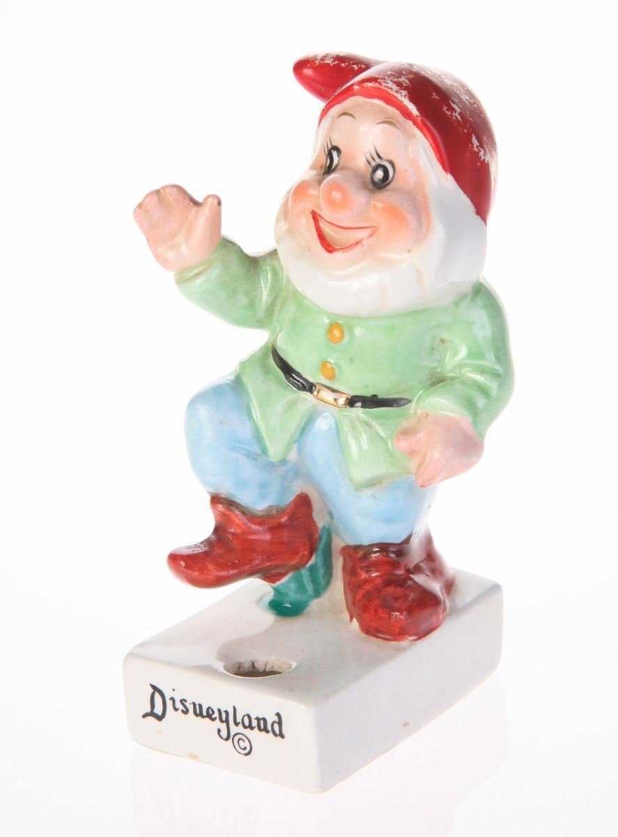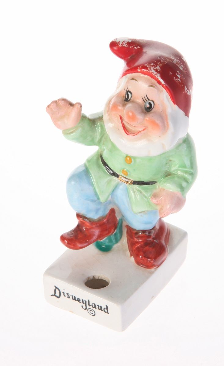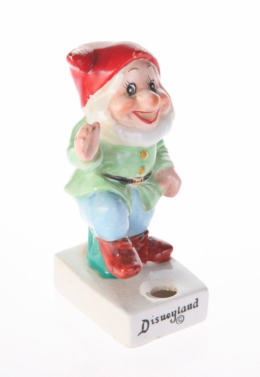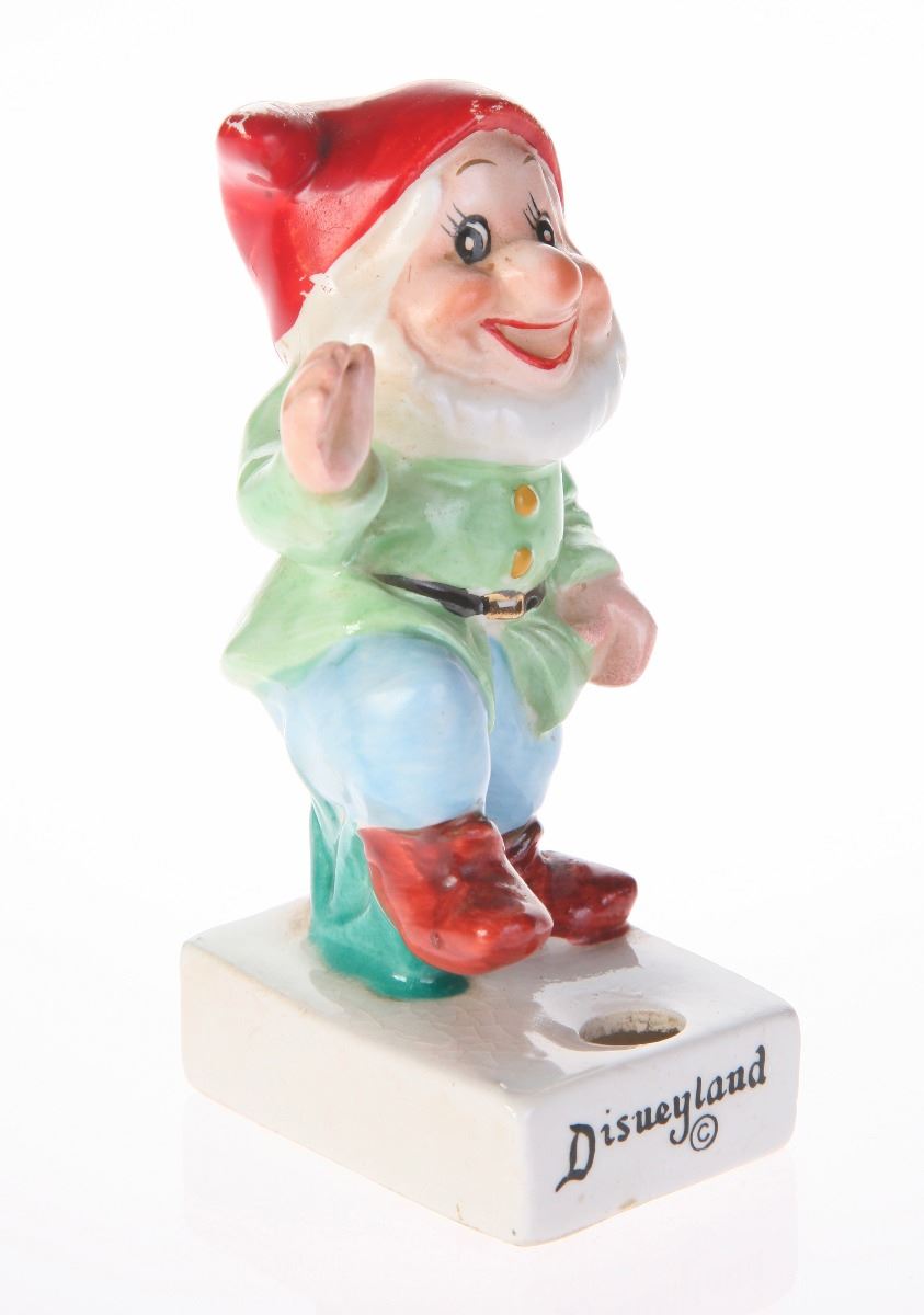 (Disneyland, 1960s) Ceramic cigarette holder featuring Happy from "Snow White and the Seven Dwarfs". "Disneyland" is displayed in black along the front of the base. Measures 2.5"x2" and 4" tall. In fair condition with some wear to Happy's hat and the base.