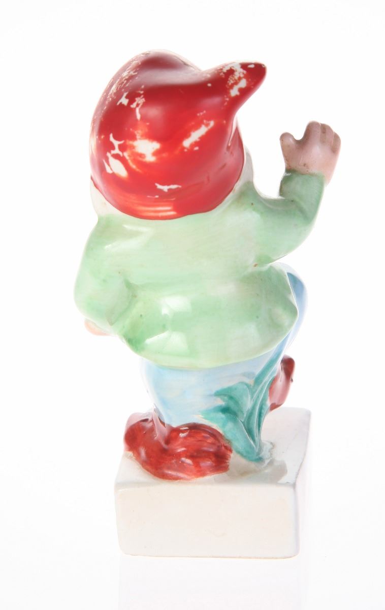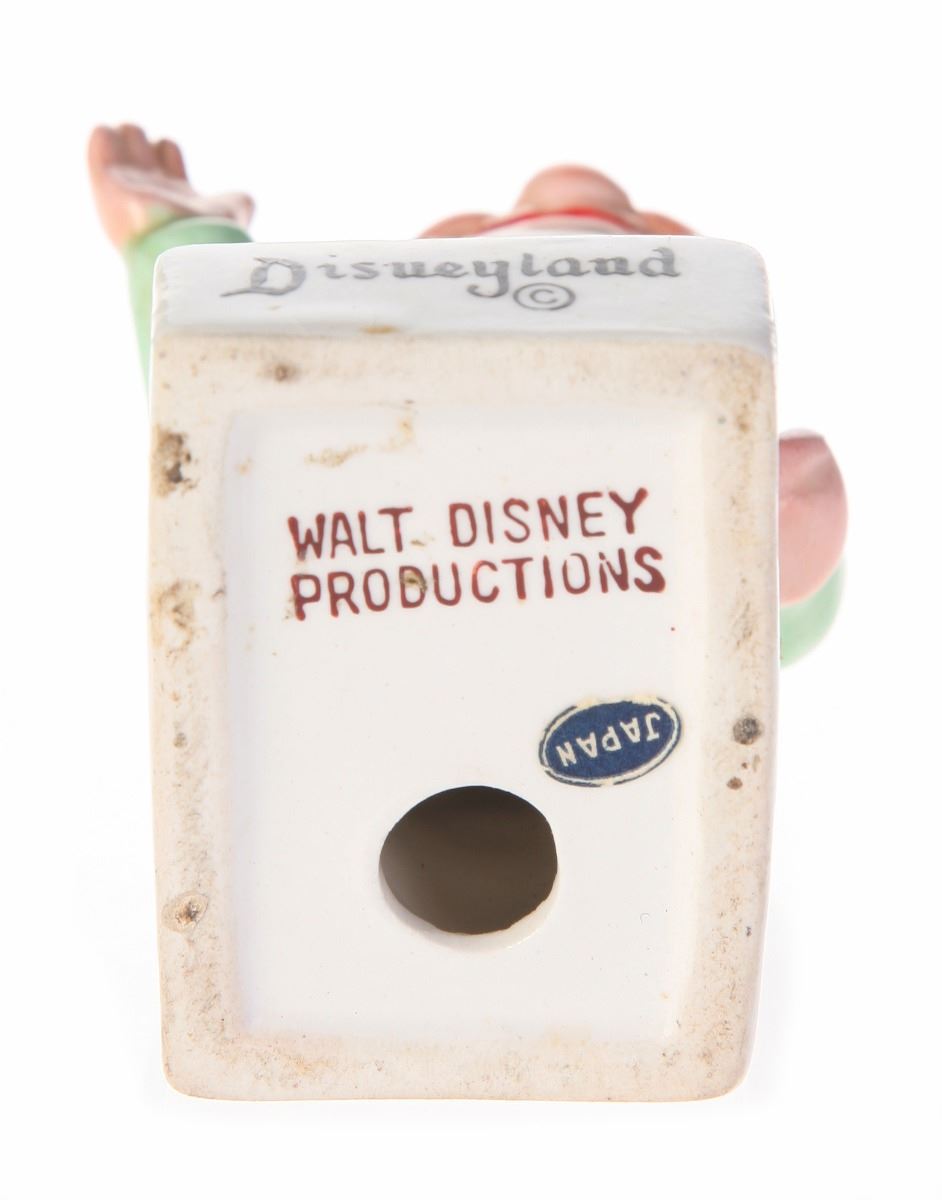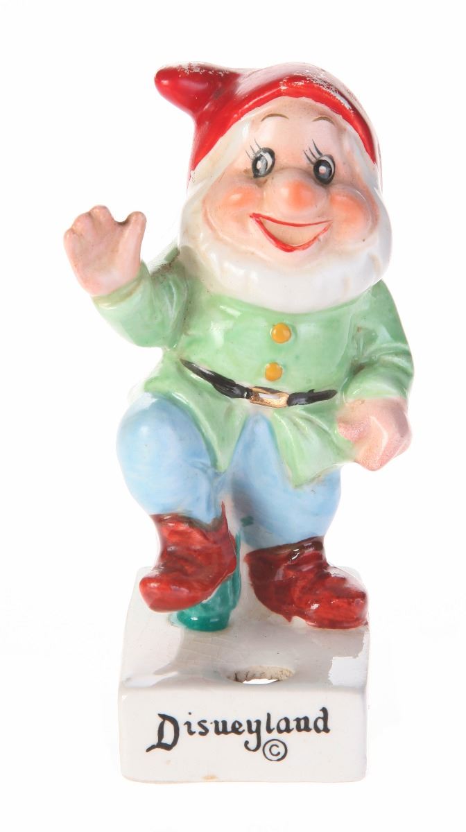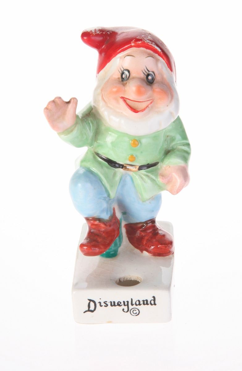 (Disneyland, 1960s) Ceramic cigarette holder featuring Happy from "Snow White and the Seven Dwarfs". "Disneyland" is displayed in black along the front of the base. Measures 2.5"x2" and 4" tall. In fair condition with some wear to Happy's hat and the base.