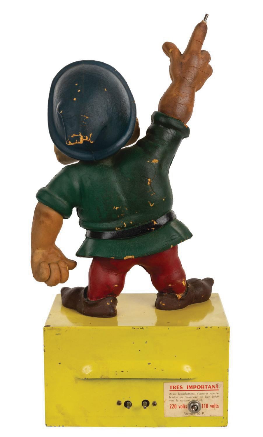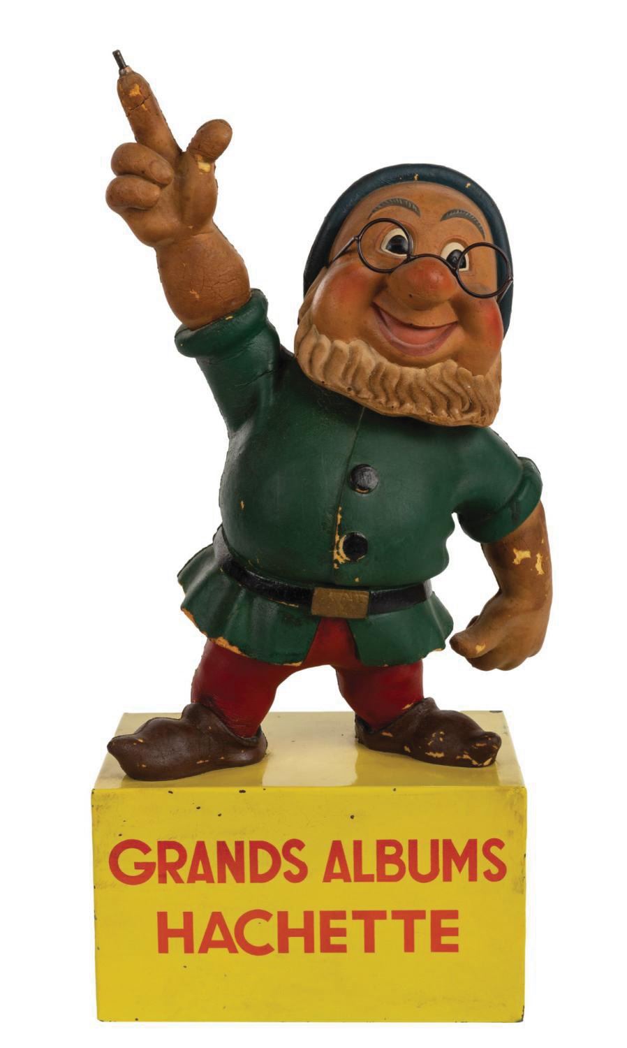 (Disney, c.1940s) An extremely rare Doc automaton figure manufactured by Publinel of Paris. The figure was produced to advertise Hachette Great Albums featuring licensed Walt Disney characters, including Snow White and the Seven Dwarfs. The figure was used contemporaneous with the French re-release of the film during December of 1944. Measuring 12" tall atop a 5" metallic base, the French-manufactured hand-painted foam figure displays in very good condition, exhibiting few scuffs, minor areas of paint loss, and some wear to the foam from automation operation. Due to their age, the electronics are untested and will likely require servicing.