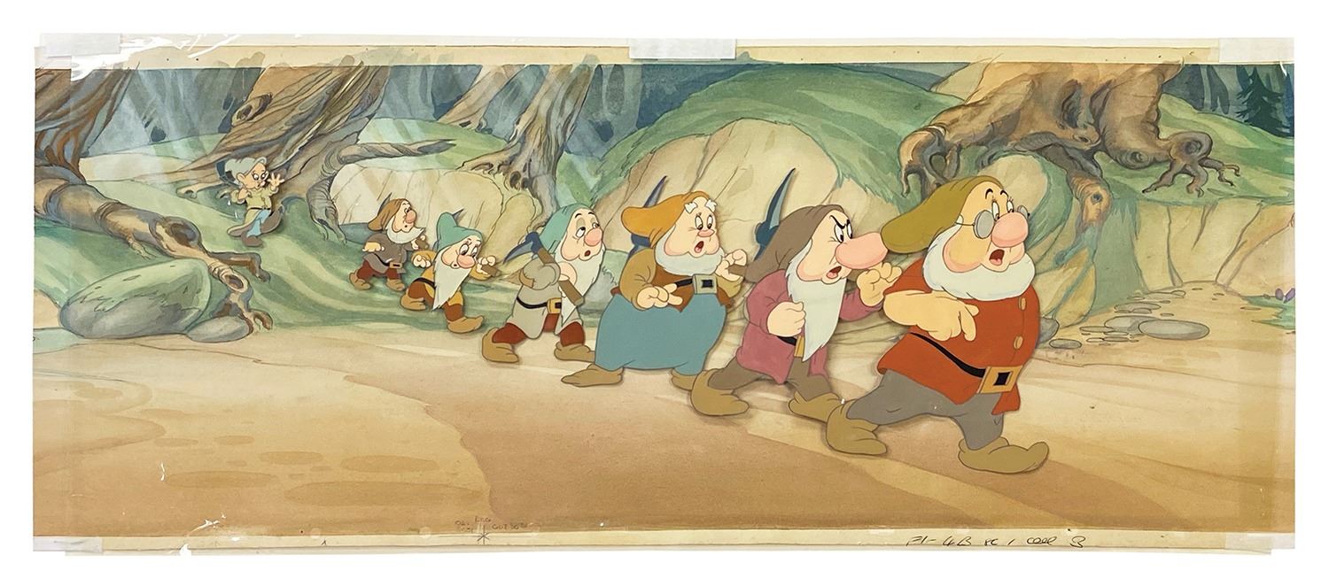 (Disney, 1937) An original panoramic production cel from Walt Disney's Snow White and the Seven Dwarfs. The cel depicts all seven of the iconic dwarfs, with six all painted on one cel layer, and Dopey being trimmed and applied from a separate cel layer. The incredible pan cel set up features the dwarfs as they march home from the mine, and has been displayed over an beautiful original pan production background from Walt Disney's Hiawatha. A common occurrence for some of the studio's early animation cels, the cels and backgrounds were paired for the purpose of looking well together visually so they could be given as gifts, rather than the priority going to matching specific scenes (or in this case even productions) together. The cel measures approximately 10"x22" and is trimmed at the top and right edges. The background measures 9.5"x23" and is trimmed at the left and right edges. The condition is very good given its age, with a minor waviness to the cel, and a few thin cracks in the paint of Doc and Sneezy. Surviving cels featuring all seven of the dwarfs are exceptionally scarce, with this example being one of the greatest we have seen in recent years.