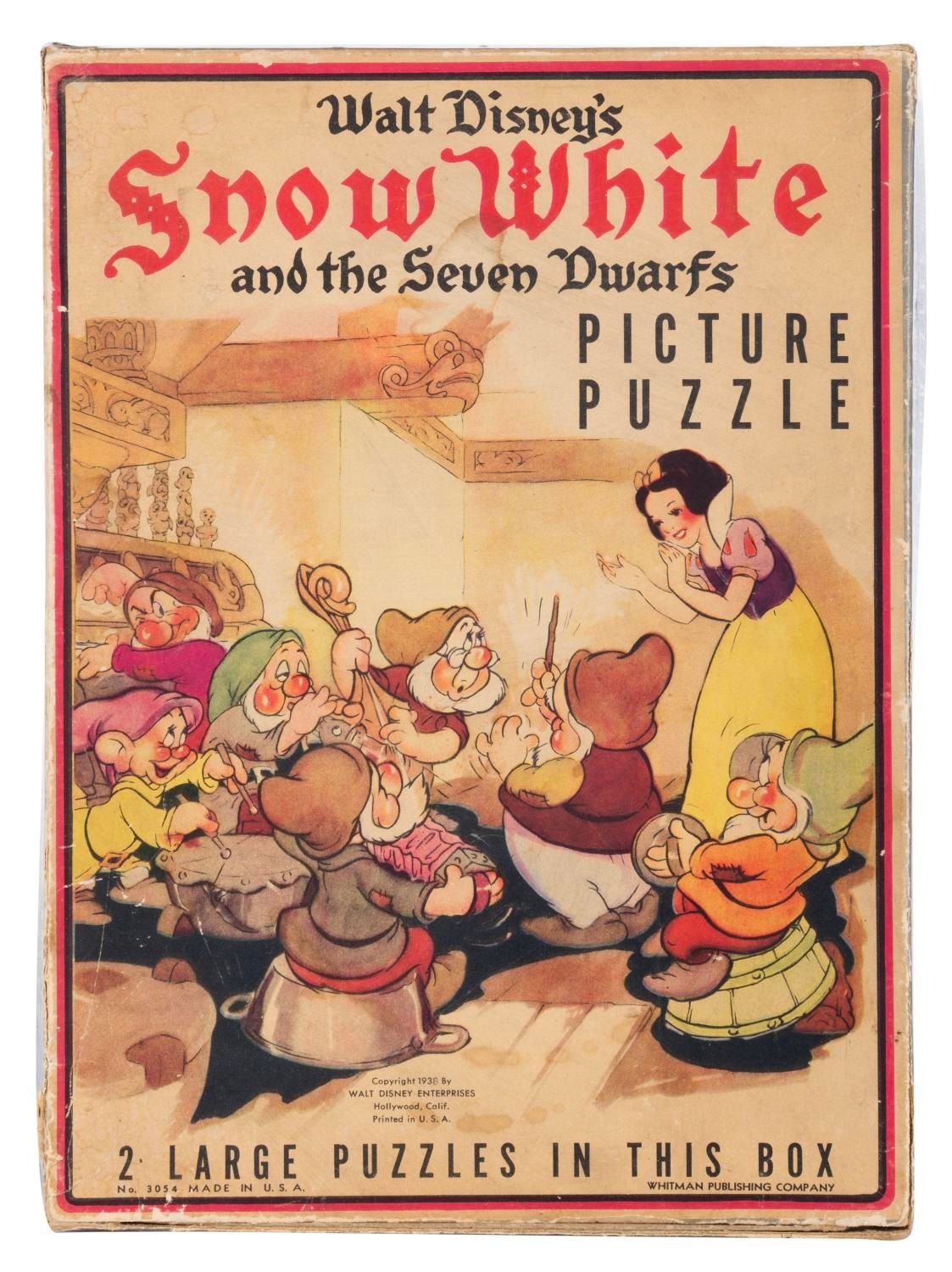 (Whitman, 1936) A complete "Walt Disney's Snow White and the Seven Dwarfs Picture Puzzle" featuring two large puzzles. Each puzzle measures 7.5"x10.25" when completed, and are in fair condition with edge wear, bent tabs, and light foxing due to age and handling. The original box measures 7.75"x10.5" and 1" thick, and is in fair condition with discoloration, seperation of the top and bottom edges, and tape on the top and bottom corners.