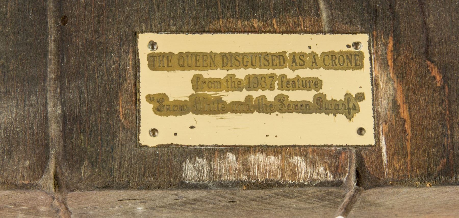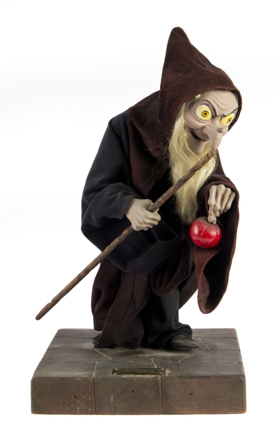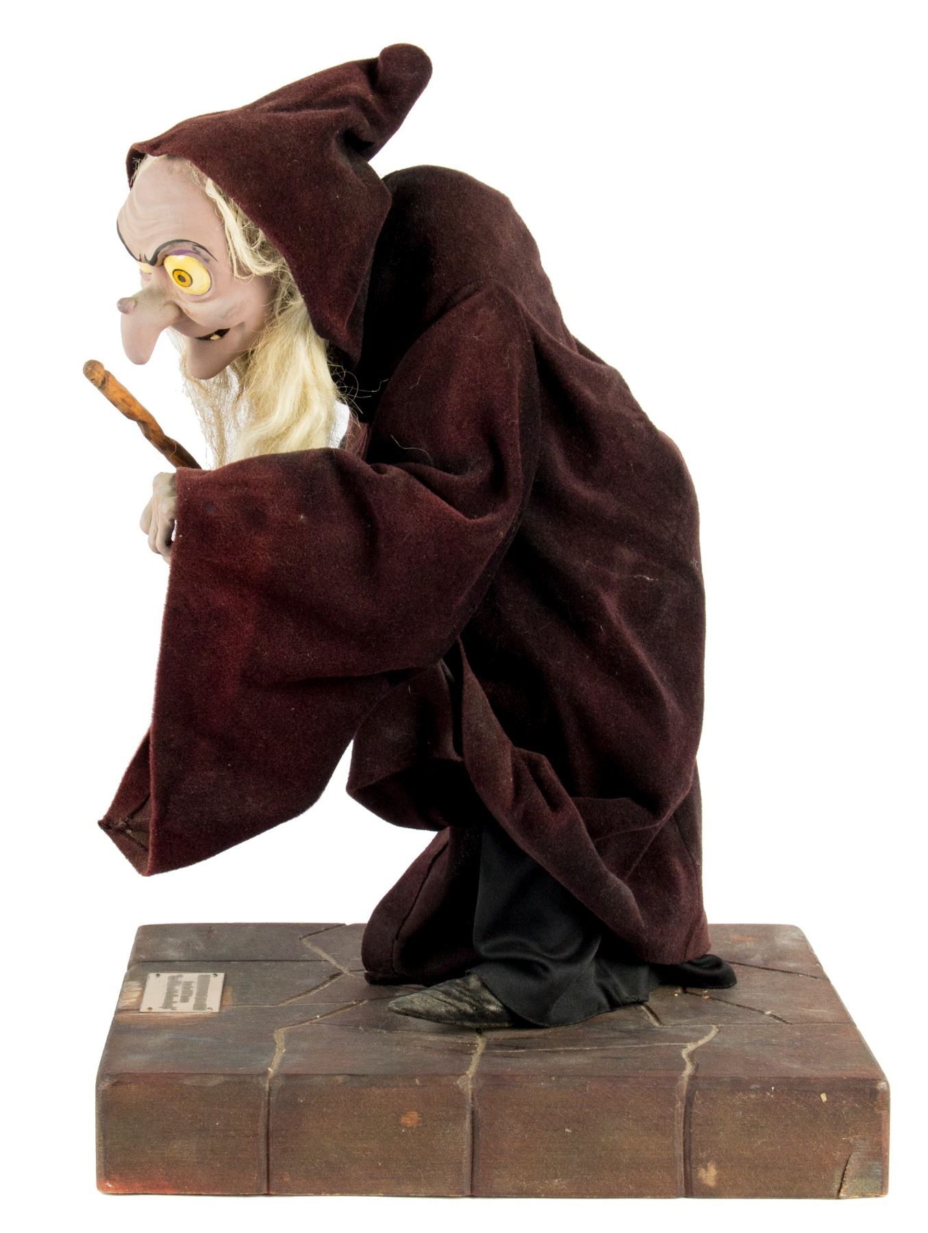(Disneyland, 1970s) An extremely rare display figure of the Evil Queen disguised as the Old Hag. This figure was created by the same WED Imagineering model makers who also created the iconic Main Street window displays in the 1970s. These figures, hand-built to the high-standards that would be used for the window displays themselves, were only created in very limited numbers and were sold at Disneyland for a short period. This Old Hag figure is accomplished in a composite resin with fake hair and a wooden base. The plaque on the base reads "The Queen Disguised as a Crone from the 1937 feature Snow White and the Seven Dwarfs". The figure measures 20" tall, 12" wide, and 14" deep, including the base. The condition is very good with minor wear.