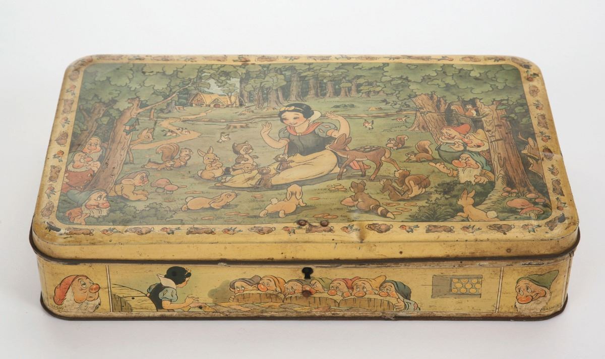 (c. 1938) Beautifully illustrated "Snow White and the Seven Dwarfs" lithographed cookie tin from Belgium. Measures 7.75"x12.75"x2.5". In good condition with moderate wear and a dent in the lid. It has a locking clasp that is not functional.