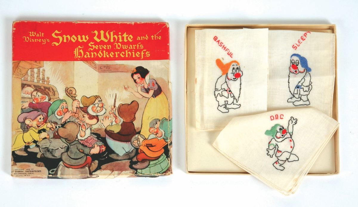 (c. 1938) Set of (3) "Snow White and the Seven Dwarfs" Handkerchiefs in the original box. In good condition with wear to box and light staining.