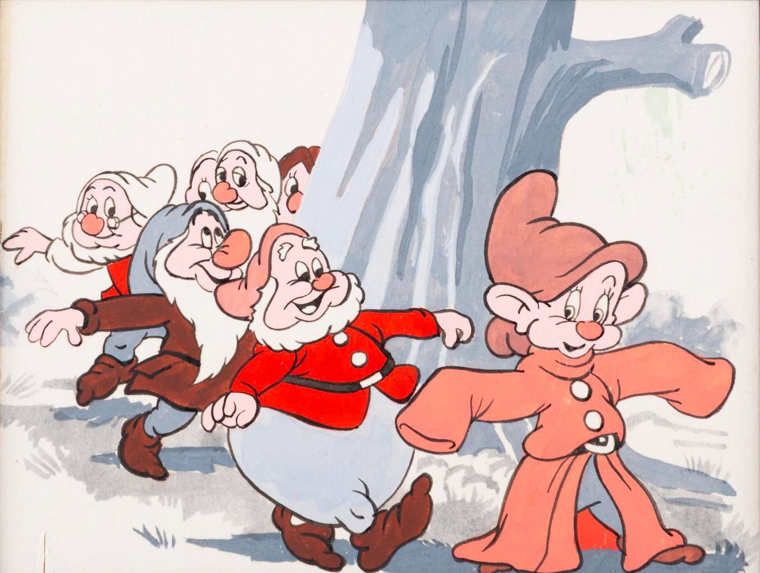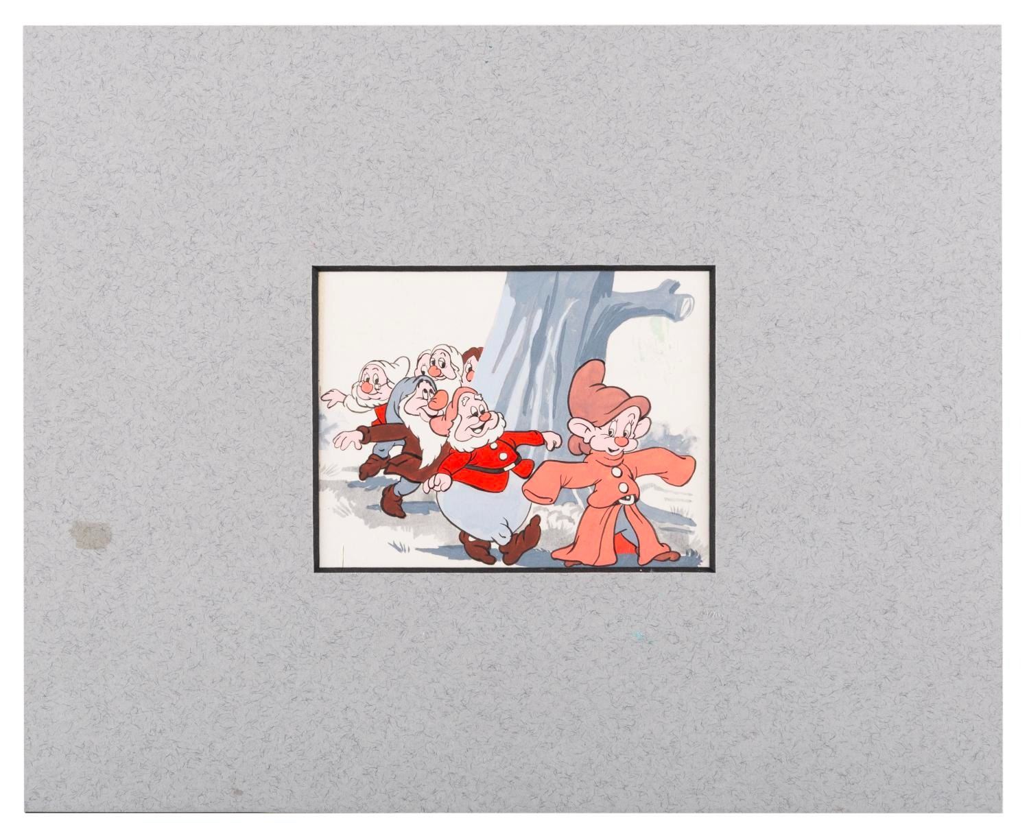 (Disney, 1973) Original art of the Seven Dwarfs from "Snow White and the Seven Dwarfs" for the October 13th, 1973 issue of Walt Disney’s "Now I Know" Magazine. Measuring 4" x 3" visible in an 8" x 10" matte, the painting is in very good condition with a small cut in the lower left corner.