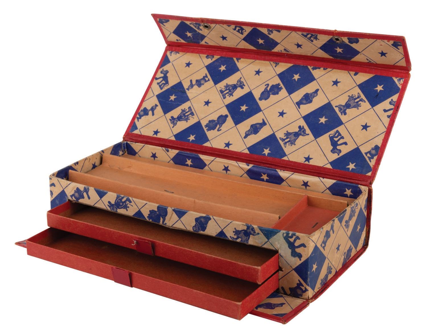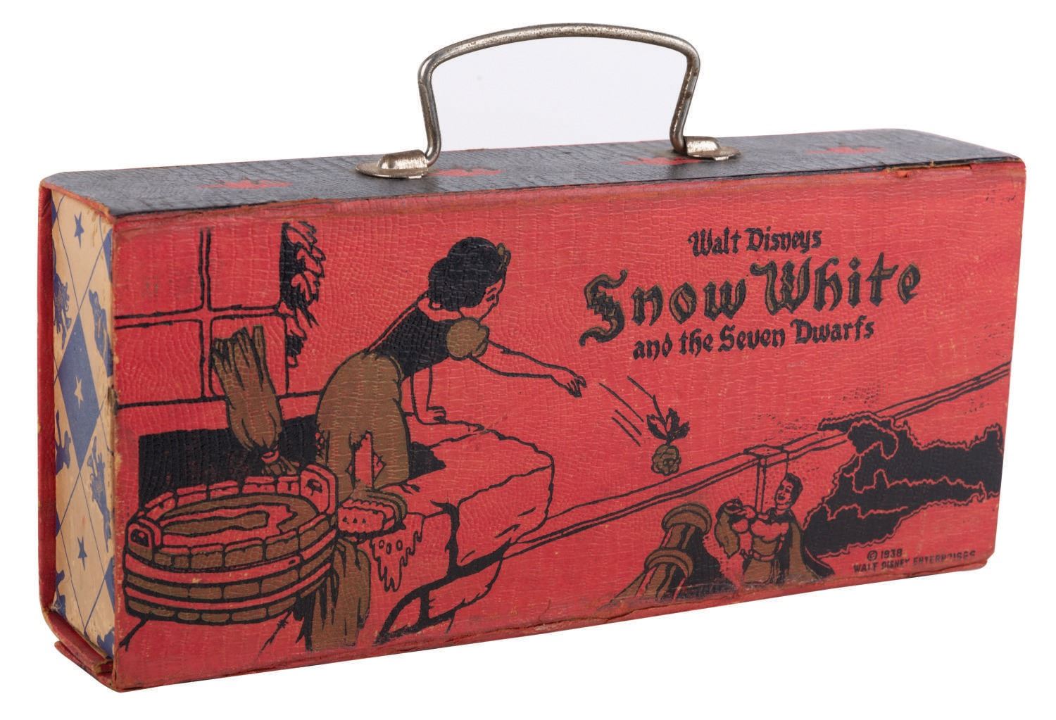 (Dixon, 1930s) A Snow White and the Seven Dwarfs pencil case manufactured by Dixon. The exterior is decorated with imagery of Snow White and Prince Charming while the interior is covered with a patterned motif featuring Mickey, Pluto, Elmer Elephant and others. The pencil case is comprised of cardstock material with stapled construction, two drawers, and hinged lid with snap button fasteners. Measuring 9.75"x4.5"x2", the box is in good condition with few creases and dents, and minor wear and tear to edges and corners.