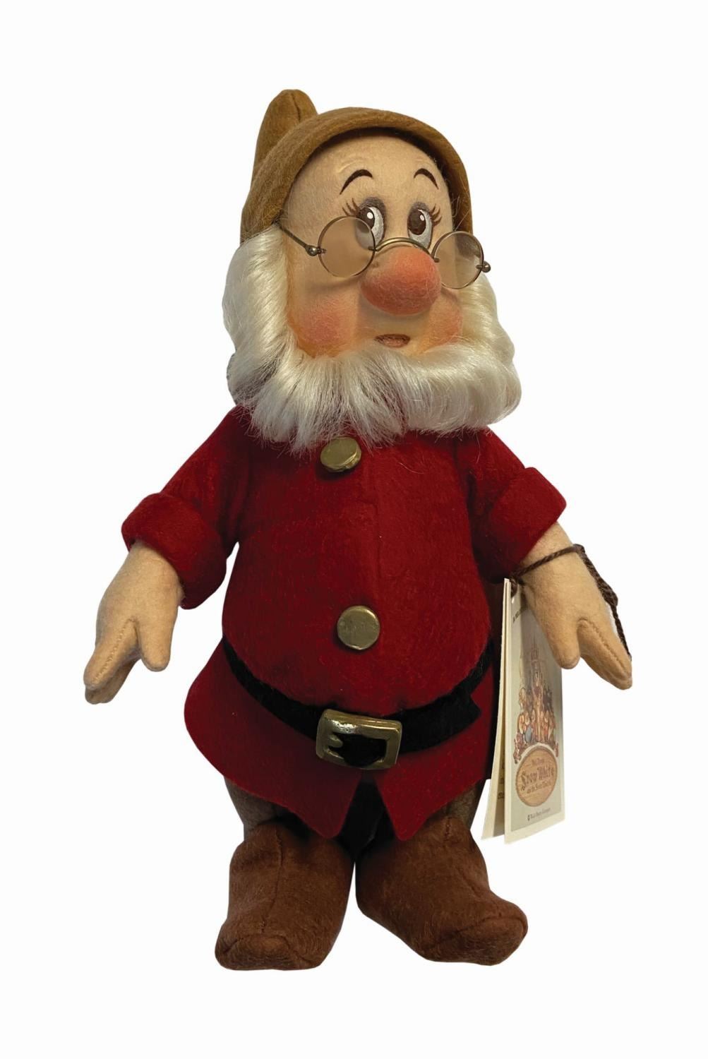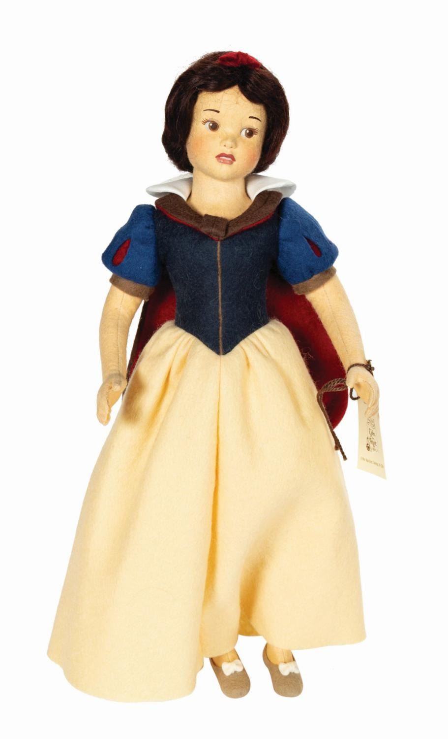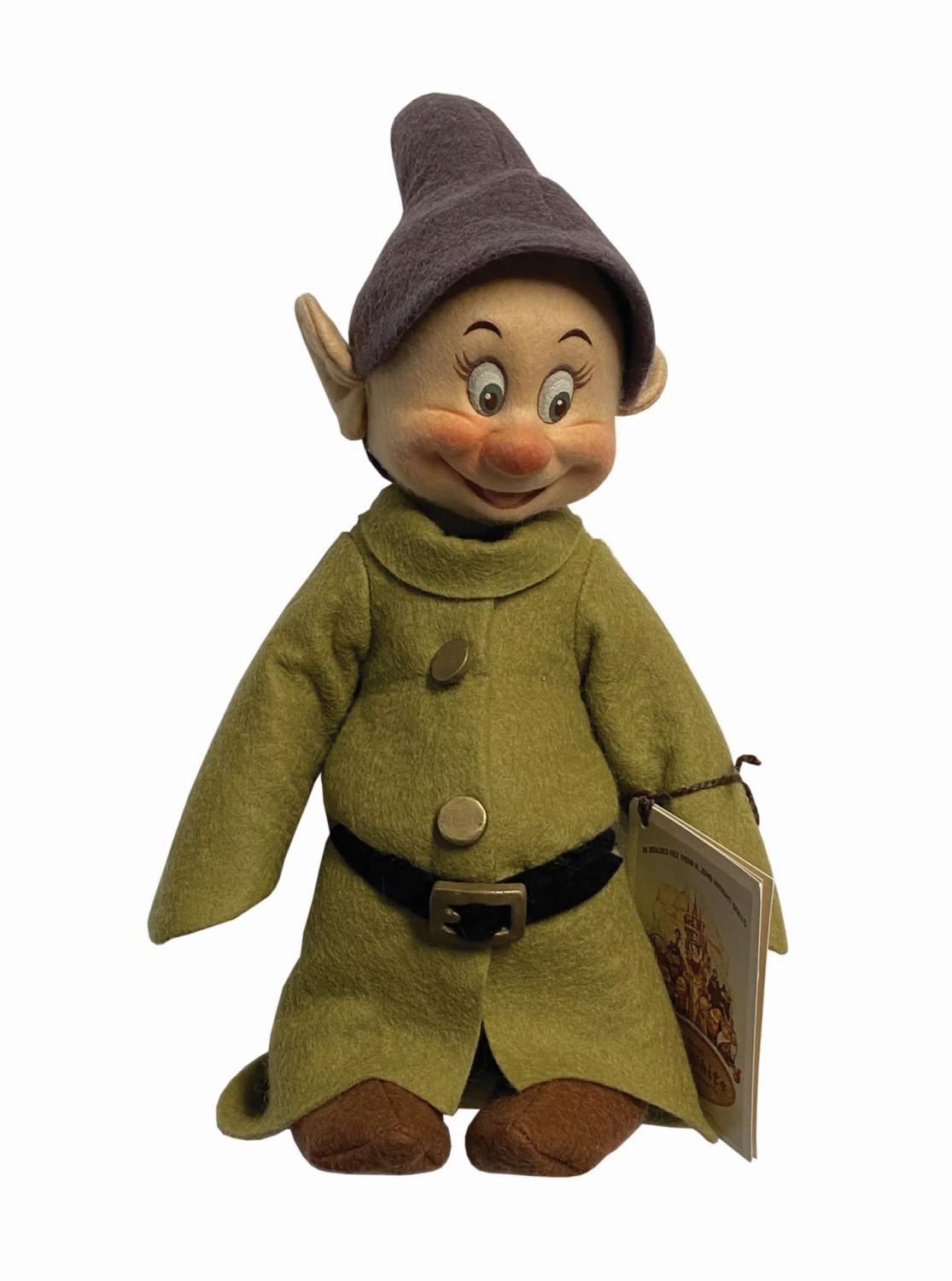 (Disney, 1989-94) A complete set of (8) Snow White and the Seven Dwarfs dolls manufactured by R. John Wright and released in a limited edition of 2500 between 1989 and 1994. The jointed, fully posable felt dolls feature pressed felt faces meticulously hand-painted in screen accurate detail with English mohair wigs and, in the case of the Dwarfs, beards. The costumes were crafted of hand-dyed materials with the aid of extensive film research in the Disney Archives. Dwarf dolls include Dopey, Doc, Happy, Sneezy, Bashful, Sleepy, and Grumpy. The dolls retain their wrist booklets and the original boxes with an edition numbered labels marked, "0884/2500." Snow White measures 16" and the Dwarfs approximately 11". The set is in very fine, as-new condition. Snow White's box measures 5.25"x18" and 9.25" deep and the Dwarfs' 11.25"x6.25" and 4.5" deep. All boxes exhibit only minimal shelf wear.