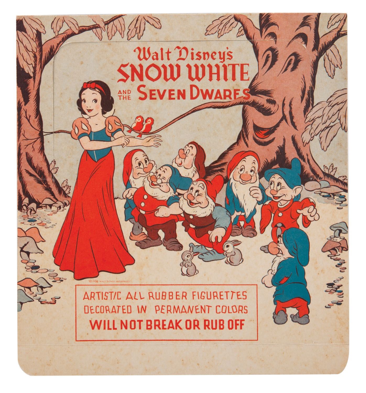 (Disney, 1937) A rare display backing card for Snow White and the Seven Dwarfs "figurettes" produced by the Sieberling Rubber Company. Measuring 9.75"x9", the two-color cardstock display is in overall very good condition.