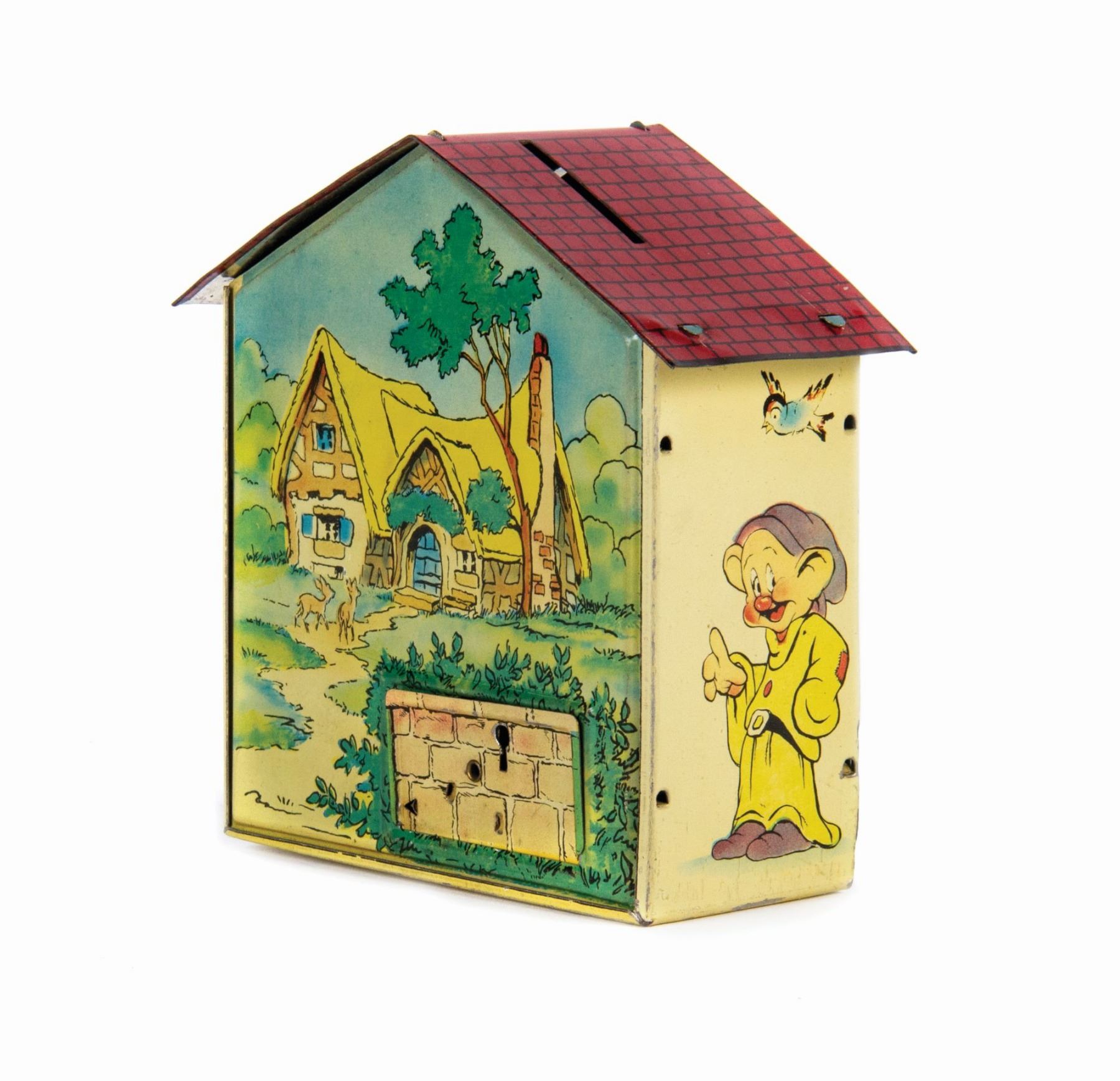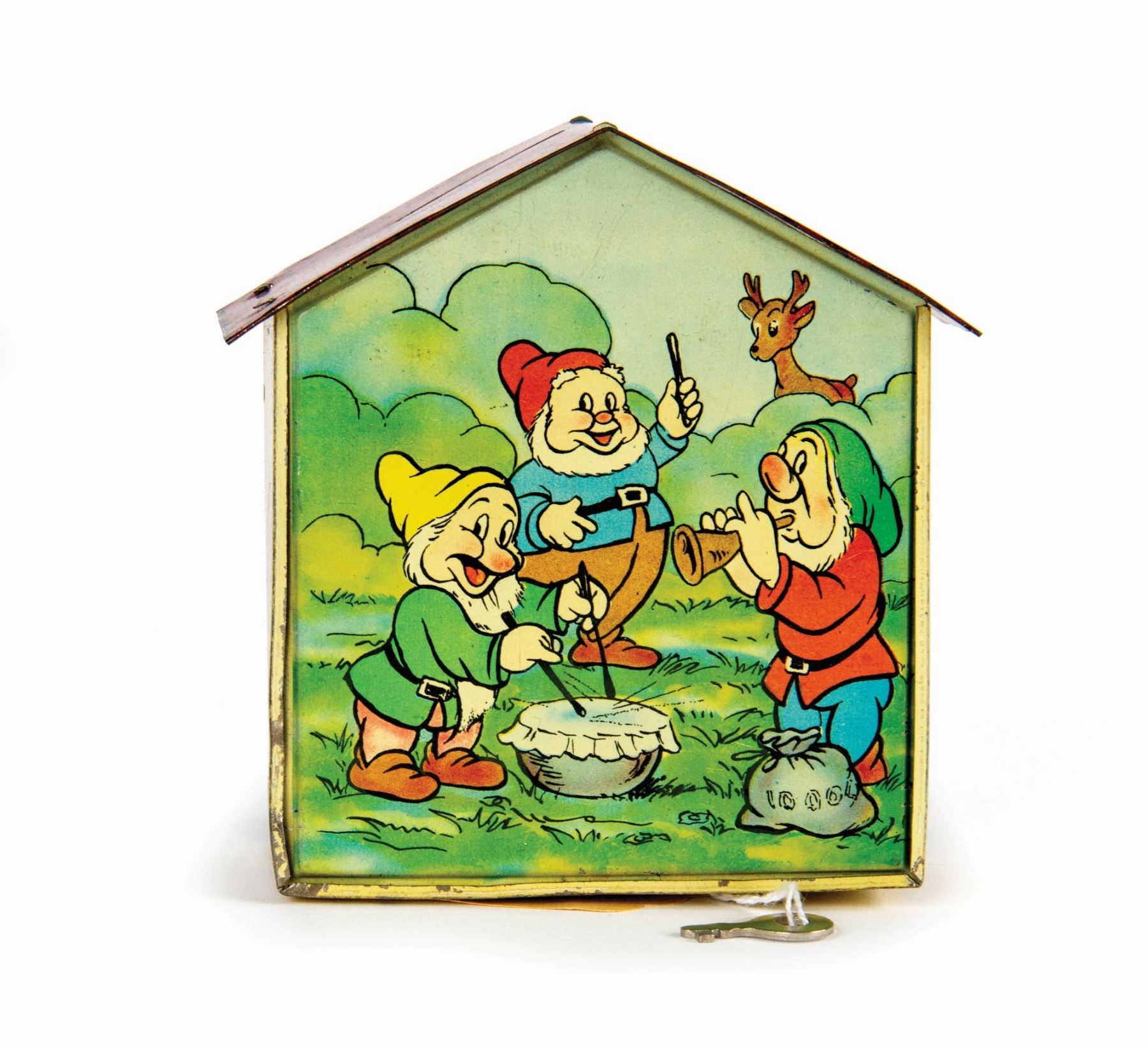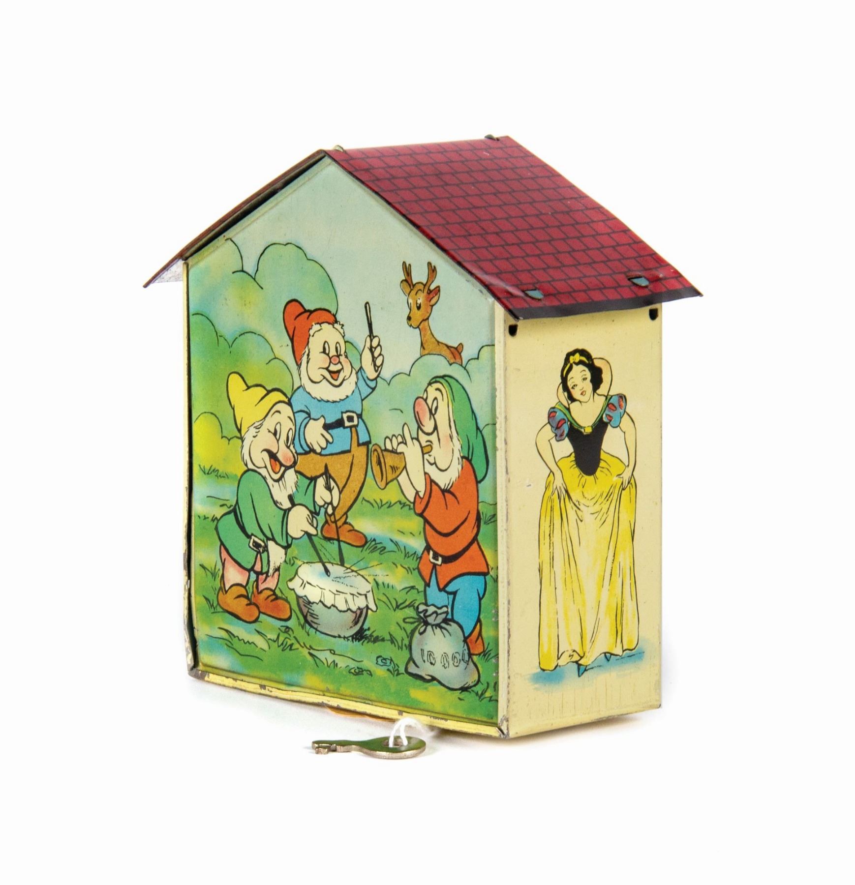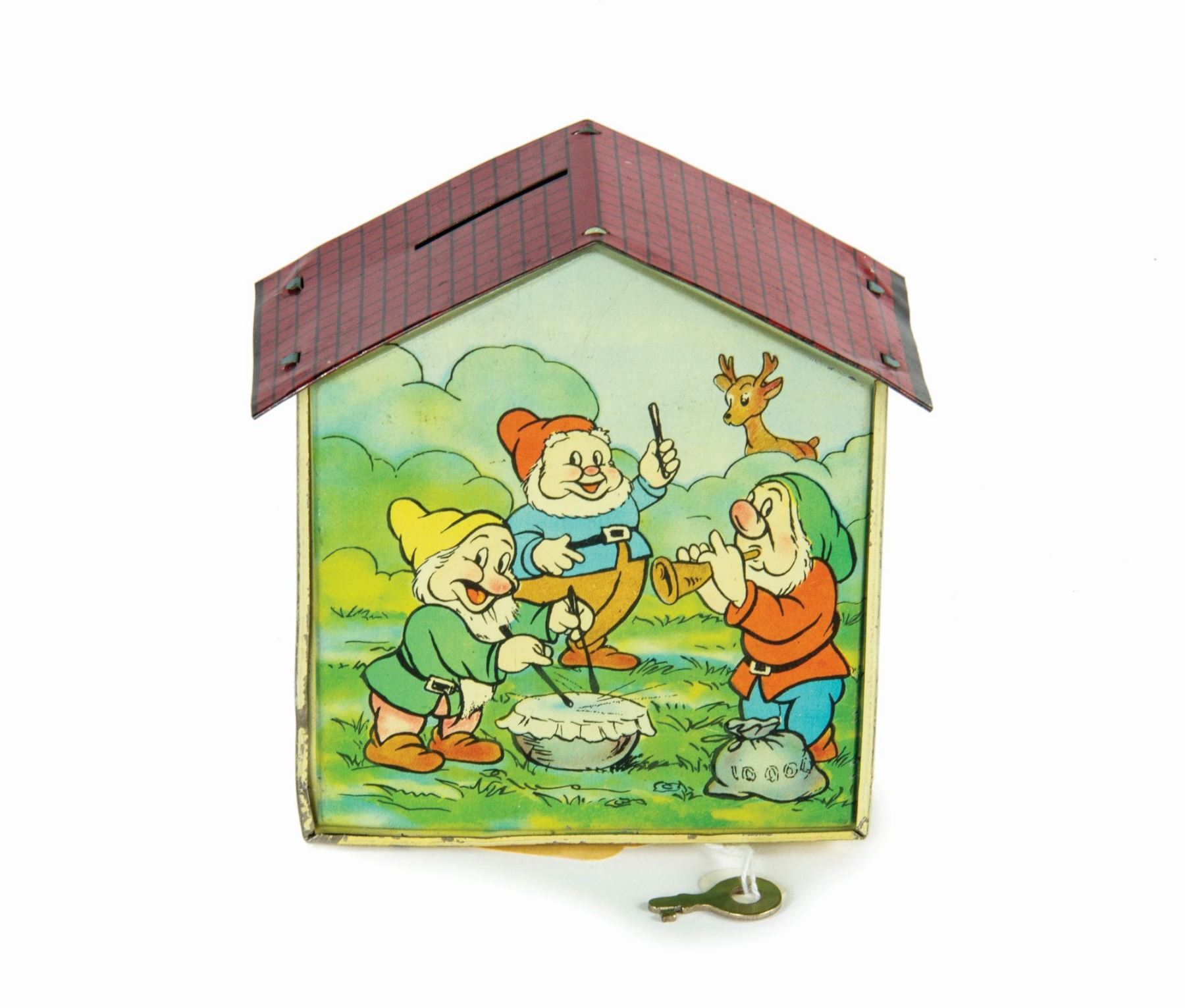 (Jouets, c.1938) A beautifully illustrated tin-litho bank featuring imagery based on Snow White and the Seven Dwarfs. The bank was created by Jouets Mont-Blanc and includes the original locking back panel. The bank comes with a functioning key to unlock the back panel. Measuring 5"x5" and 2.5" thick, the bank is in very good condition with minor surface and edge wear.