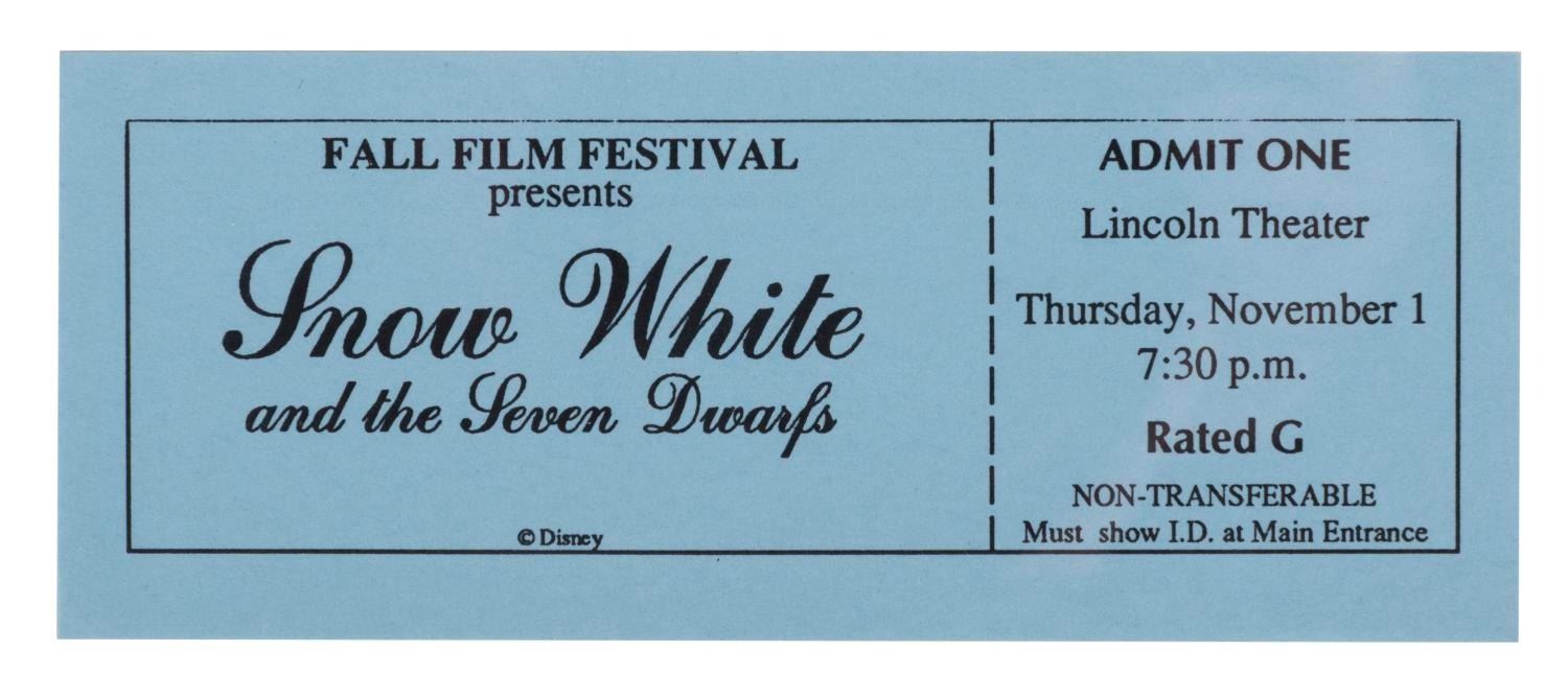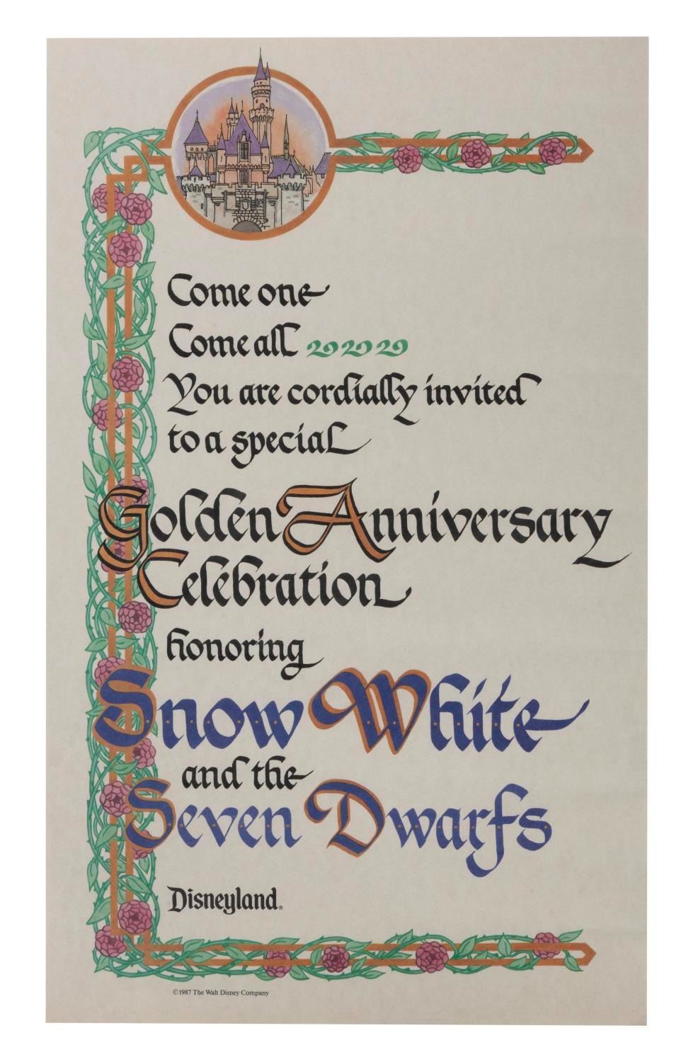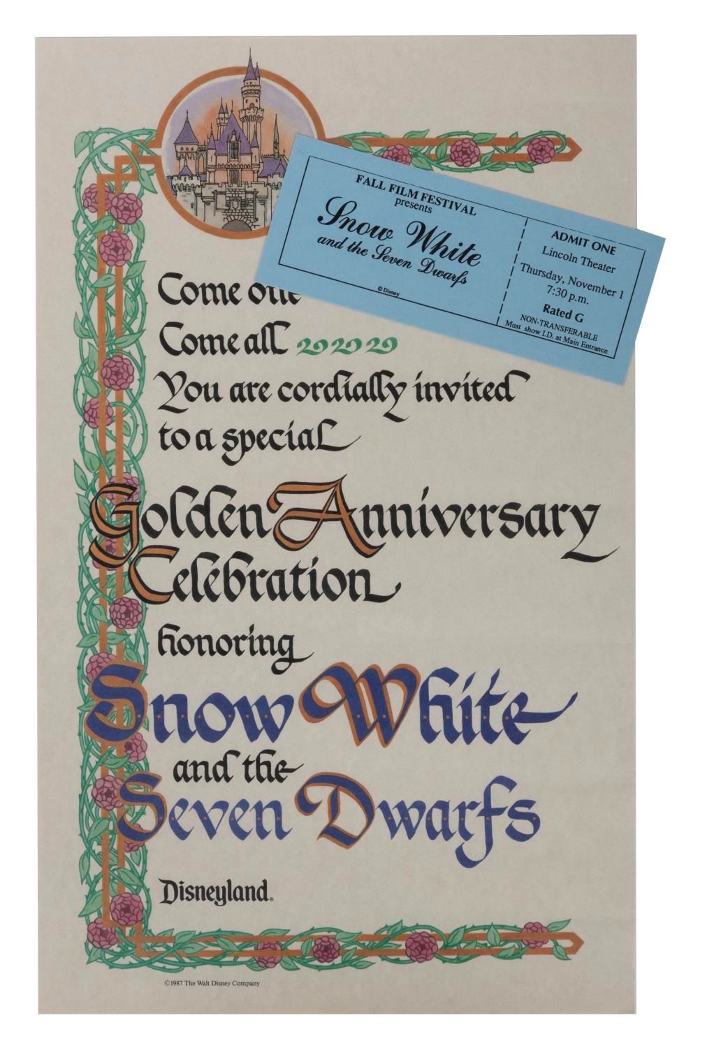 (Disneyland, 1987-90s) A Snow White's Golden Anniversary invitation, and a ticket to the Disneyland Cast exclusive screening of the film. Measuring 8.5"x14" and 5.5"x2.25", each piece of rare Disneyland ephemera is in very good condition with minor creases and wear.