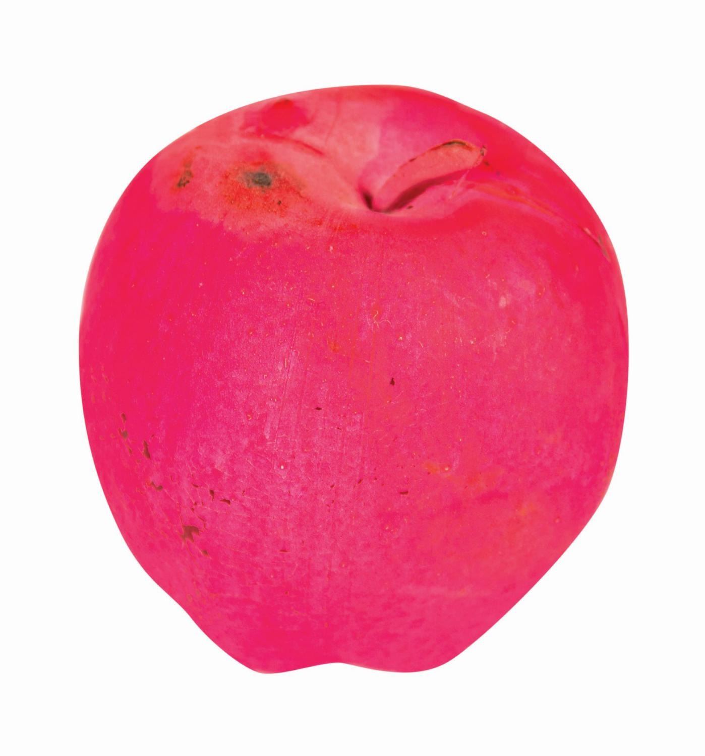 (Disneyland, c.1960s-70s) An original poison apple prop from Snow White's Scary Adventure at Disneyland. Infamously, in the early years of the park, many park guests would happily oblige the old hag's invitation by stealing the proffered poison apple prop. It became such a problem that cast members would keep a spare supply of apples backstage to replace as needed. This apple prop is hand-painted with florescent UV paint over plastic to react to the black light used within the attraction. Measuring approximately 3" in diameter and 3.5" tall, the prop is in good condition with some surface wear throughout including worn areas to the paint.