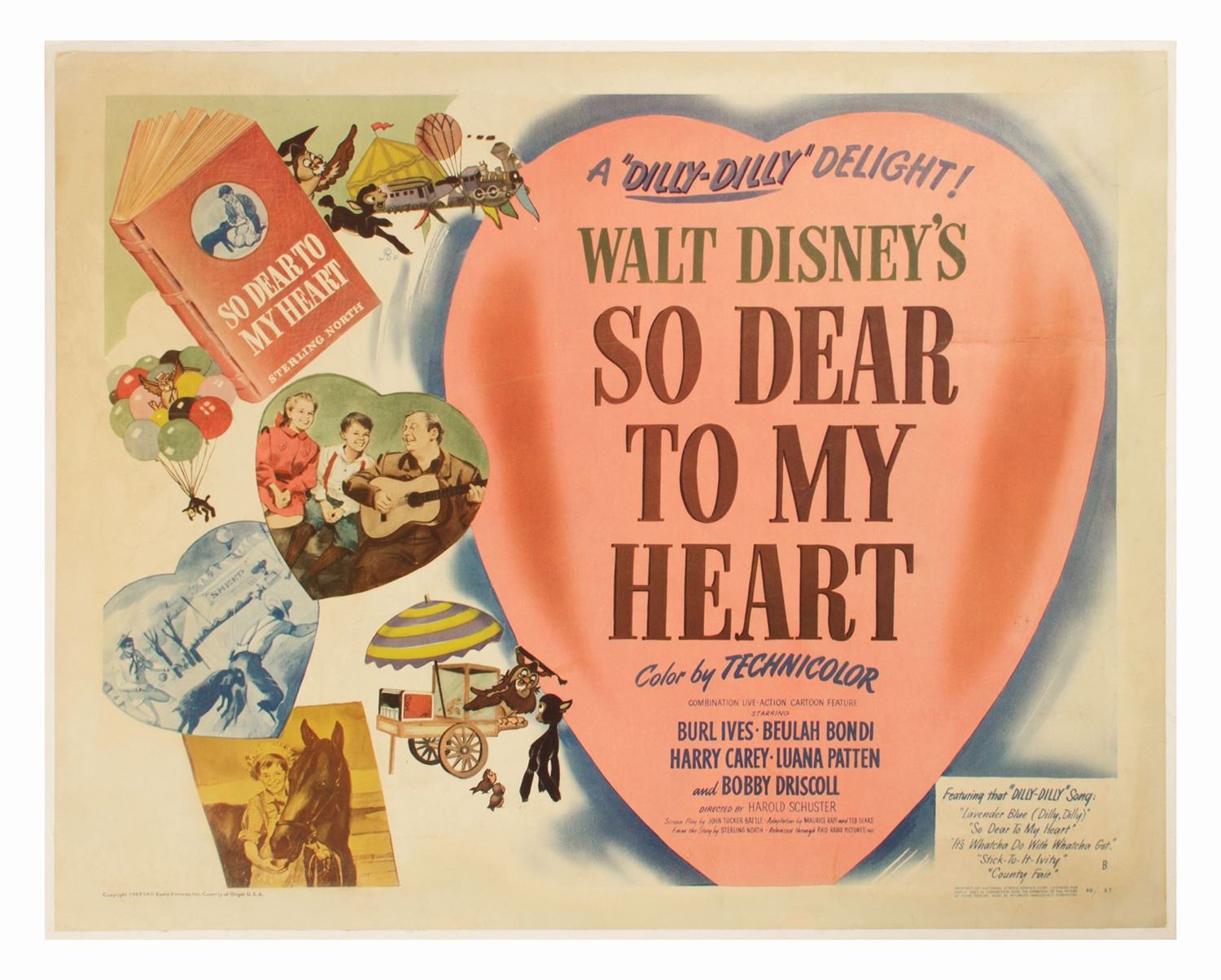 (Disney, 1949) A half-sheet Style-B poster for the anthology film So Dear to My Heart. The film earned Bobby Driscoll a Juvenile Award from the Academy for his performance as Jeremiah Kincaid. The linen-backed poster measures 22"x28" with a 0.25" linen border. The condition is fair, with small tears around the edges and a 6" tear at the upper right, all of which have been mitigated by the linen backing. There is creasing throughout, as well as several small touch-ups.