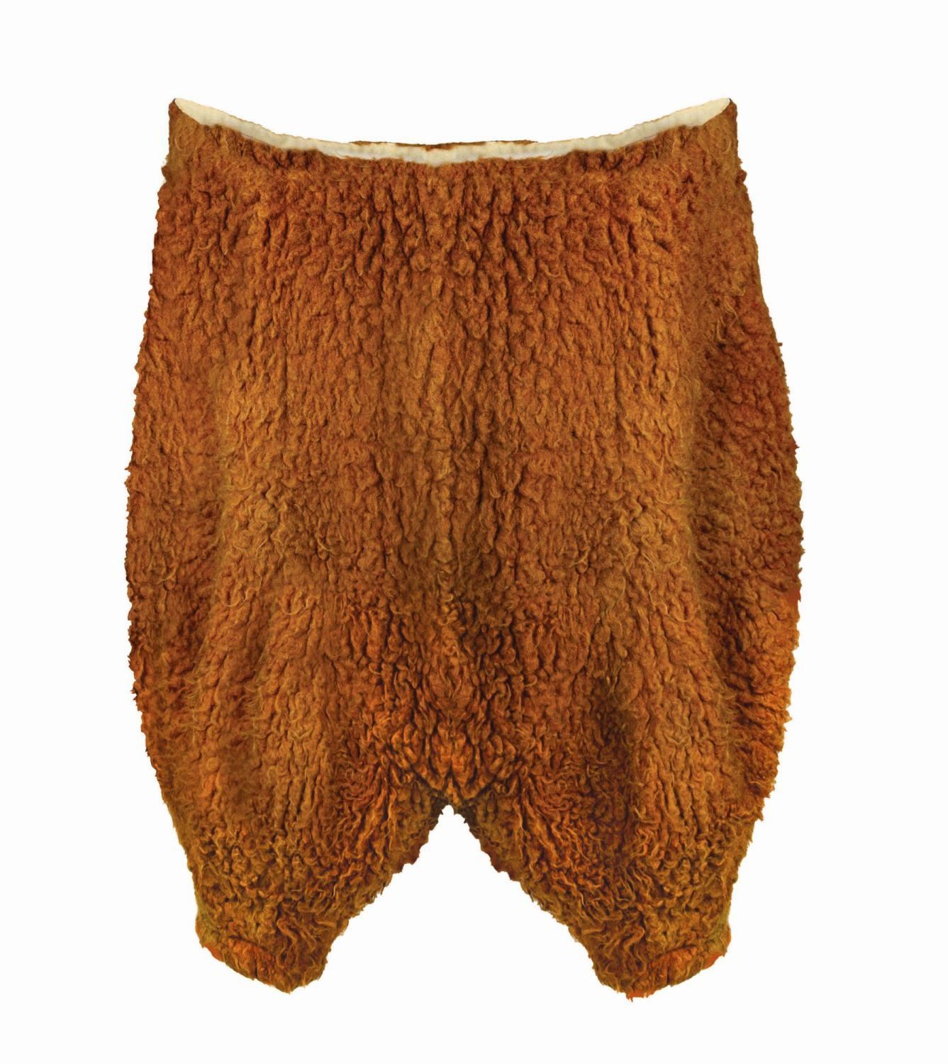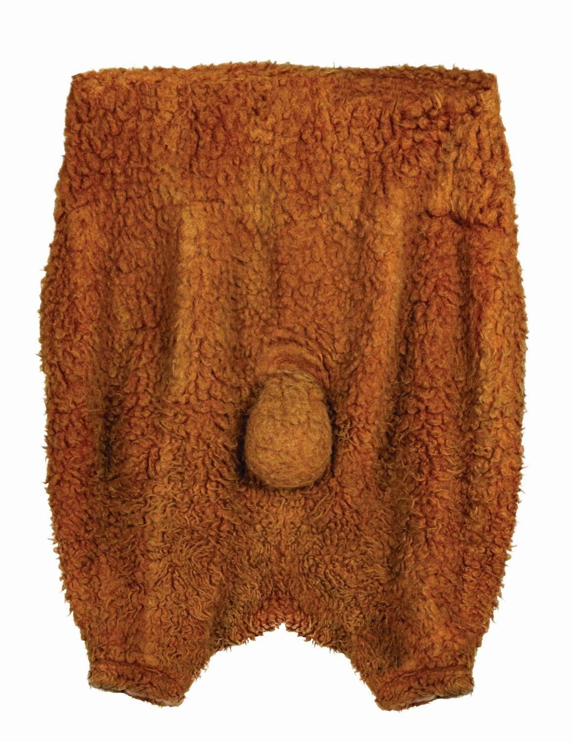 (Disneyland, c.1990s) A pair of Br'er Bear walk-around costume character pants from Disneyland's Frontierland. Constructed of synthetic fiber orange faux fur with a beige cotton cloth lining, the character pants feature a stuffed tail in back and a velcro band around the interior waist for attachment to the top portion of the costume. The front of the internal lining is marked in black ink, "9005-Car Br'er Bear." Unmarked for size, the pants are voluminous to achieve the Song of the South villain's signature mass. In recent years, the parks have gone to a more natural fur look for the Br'er Bear costume. For many, though, this fuzzy version will be fondly remembered. The character pants remain in very good condition, with some matting and frizzing to the fur and general wear.