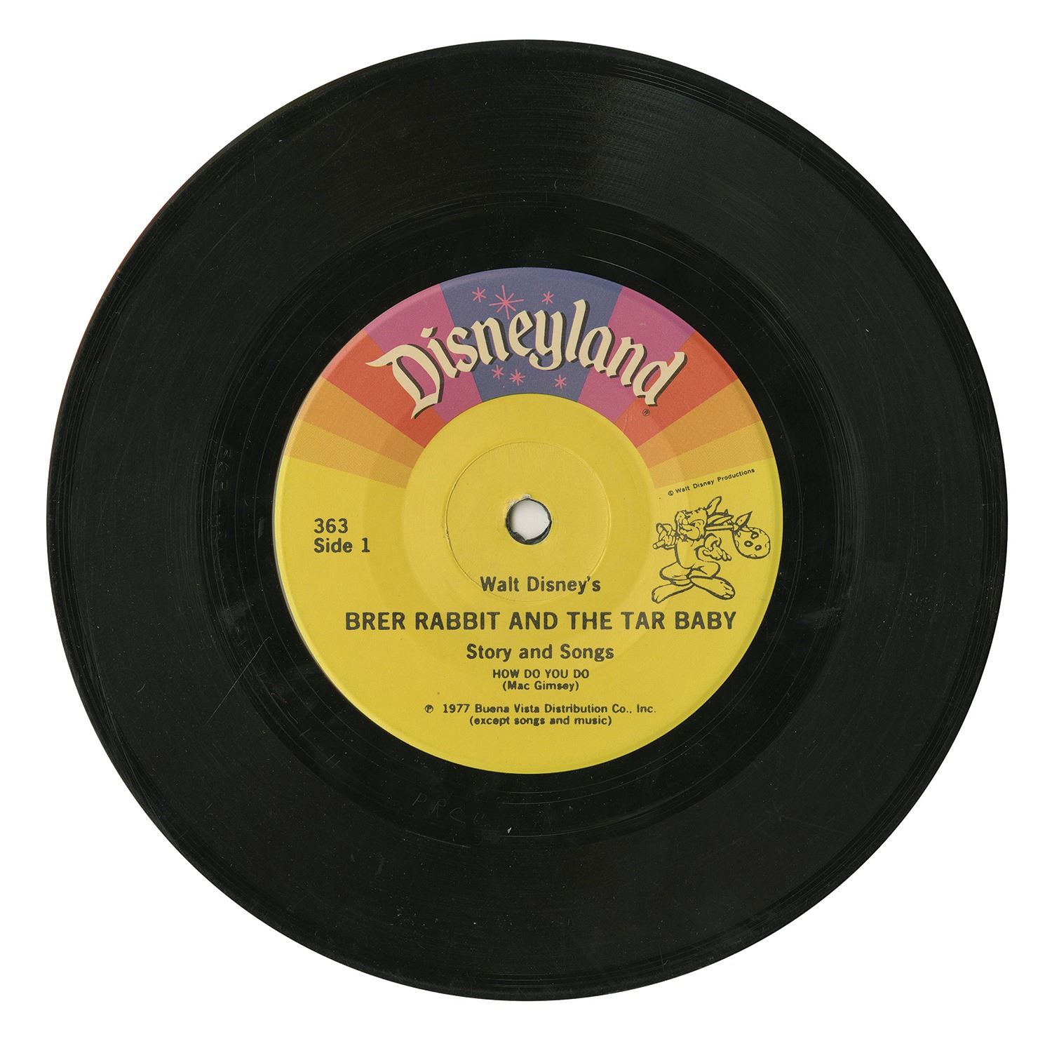 (Disney, 1971) A rare record based on Walt Disney's Song of the South titled, The Story of Brer Rabbit and the Tar Baby. This record comes with an attached 24-page storybook, and includes such memorable songs as Zip-A-Dee-Doo-Dah. The book measures 7.25"x7.25" and is in good condition with minor wear from use, and the record itself has some surface scuffs.