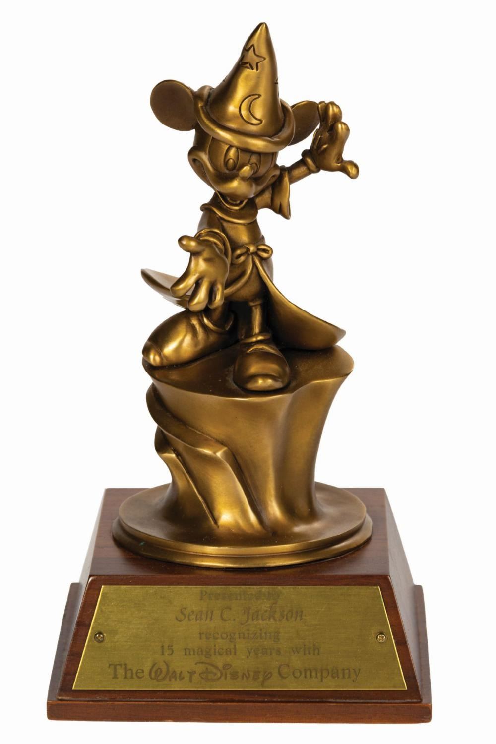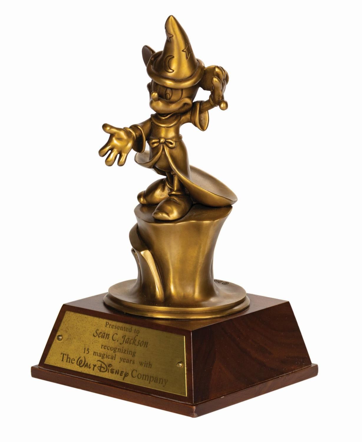(Toma, 1990s) A bronze Sorcerer Mickey award created to honor individuals for 15 years of service to The Walt Disney Company. This particular bronze was designed by renowned Disney sculptor Bill Toma, and created from his foundry. Measuring 9.5" tall, the award is in very fine condition with minor tarnishing to the metal name plate. It has a Disney copyright on the reverse.