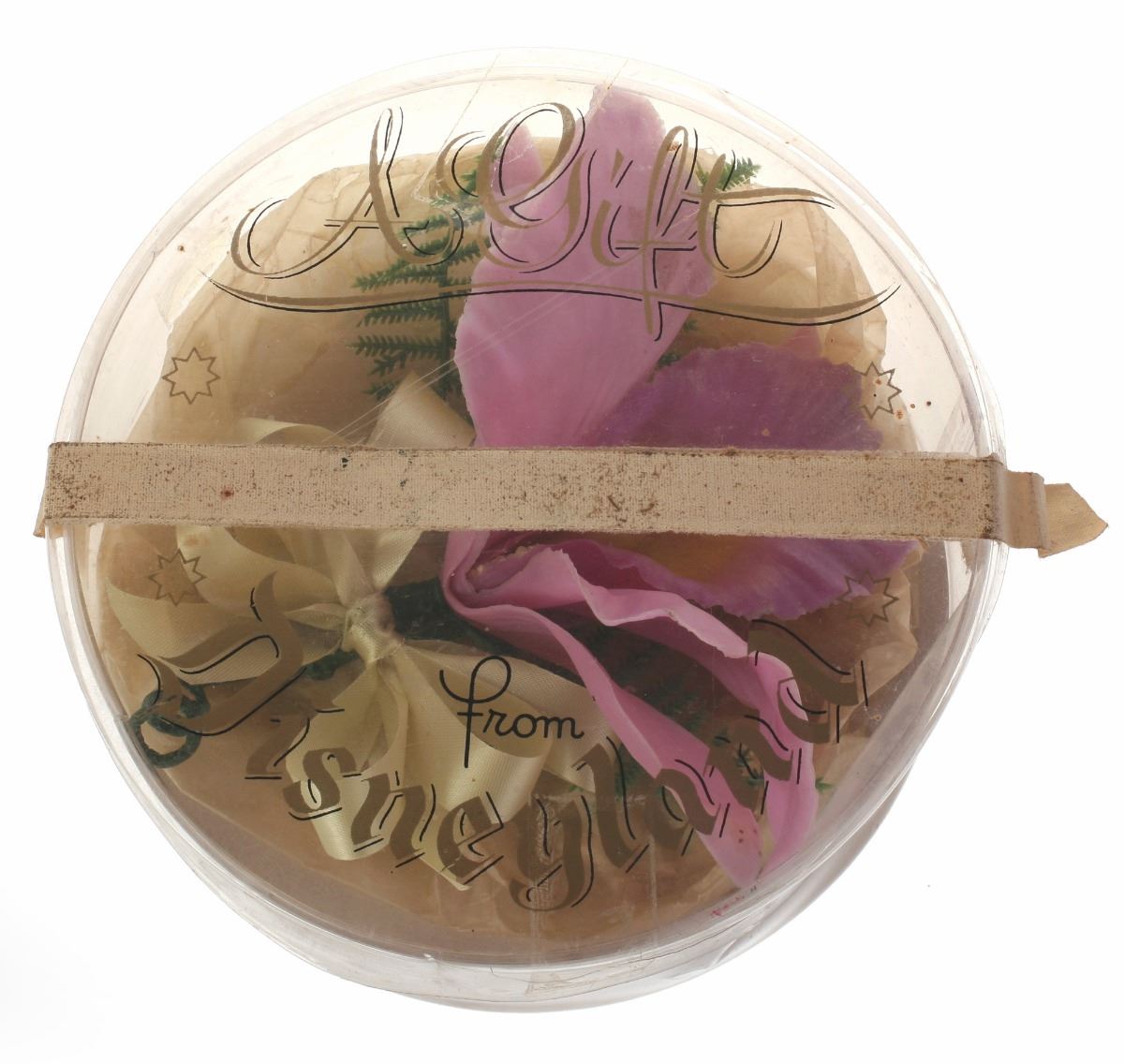 (Disneyland, 1950s) A souvenir mail-away faux-orchid from Disneyland. The circular clear container reads "A Gift from Disneyland" on the surface, and on the bottom is hand-written "sent by Vernie from Calif". Flower comes with its original box and tissue paper. Box measures 6" in diameter and 2.5" tall. In good condition with some wear to the box.