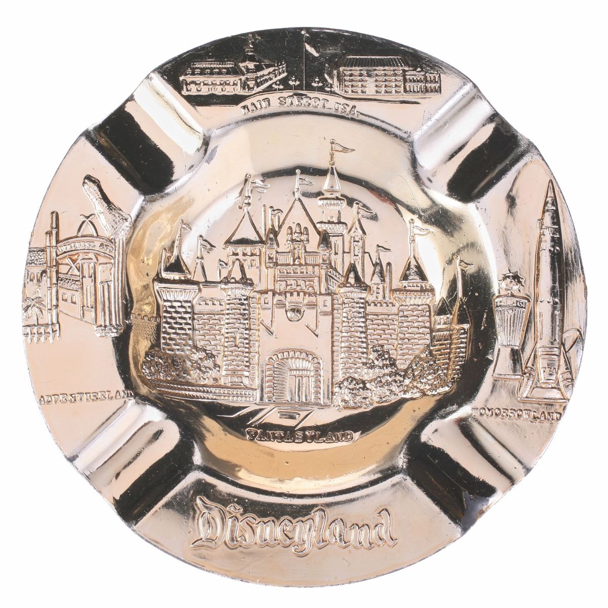 (Disneyland, 1950s) Souvenir ashtray featuring the different lands of the park in a dazzling gold-tone. Measures 4.5" in diameter and 0.5" tall. In good condition with some scuffing.